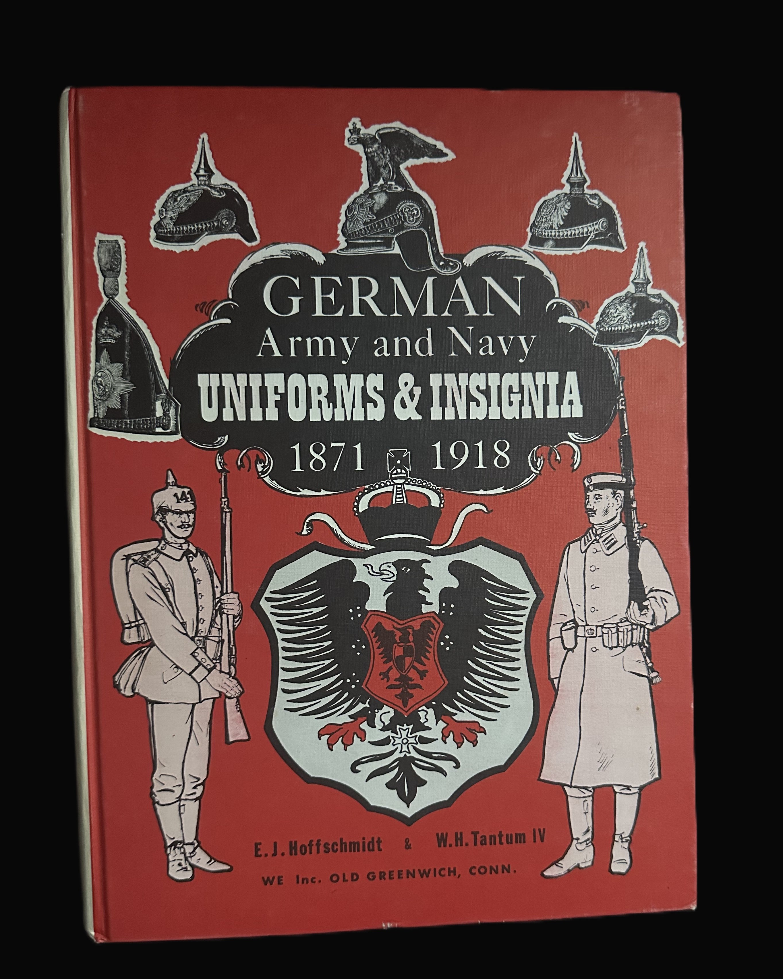 This item is identified as the reference volume “German Army and Navy Uniforms & Insignia 1871–1918” by E. J. Hoffschmidt and W. H. Tantum IV, published by W.E. Inc., Old Greenwich, Connecticut. It is a postwar collector and historian reference book focused on Imperial German military uniforms, insignia, and equipment spanning the period from the founding of the German Empire through the end of the First World War.