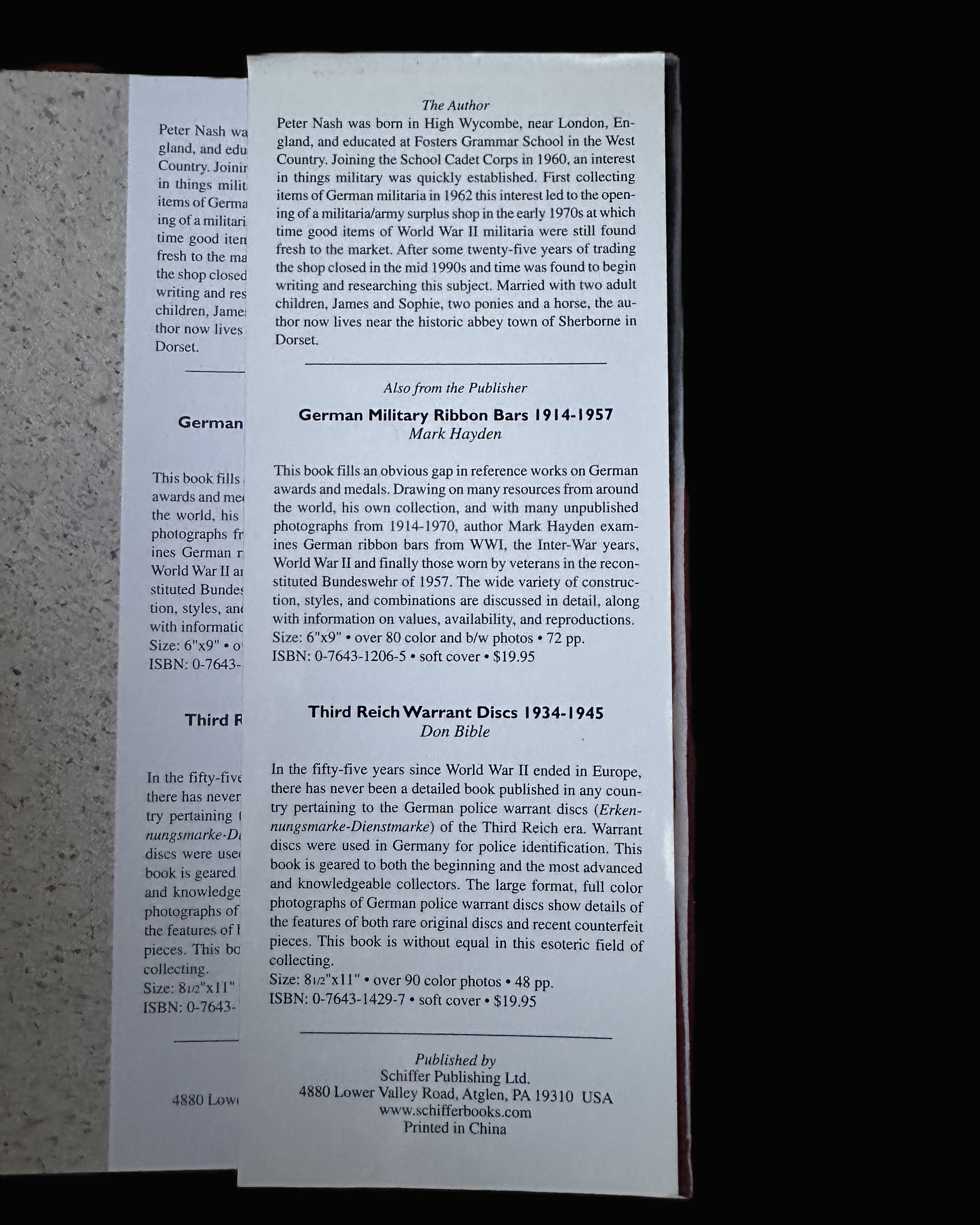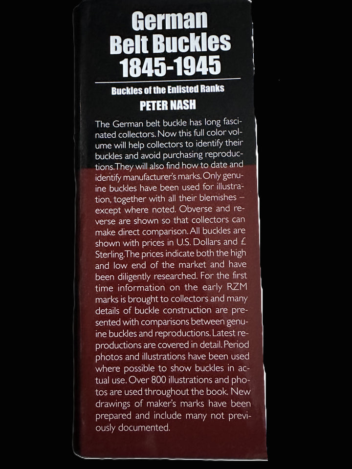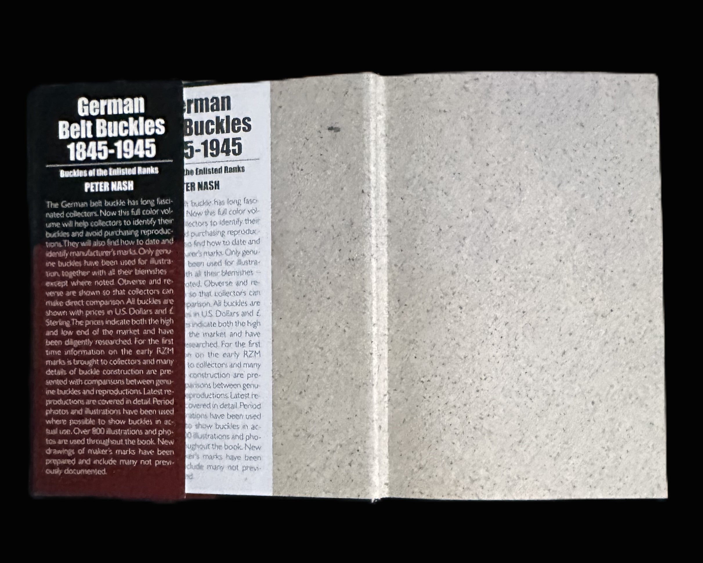 This hardbound Schiffer reference volume presents a comprehensive, photograph-rich study of German belt buckles and associated equipment spanning a full century of military, political, and civil organizations. The exterior shows the well-known Schiffer gloss finish with Nash’s cover design featuring both Imperial and Third Reich enlisted buckles. The book retains its original dust jacket, which remains clean and fully intact.