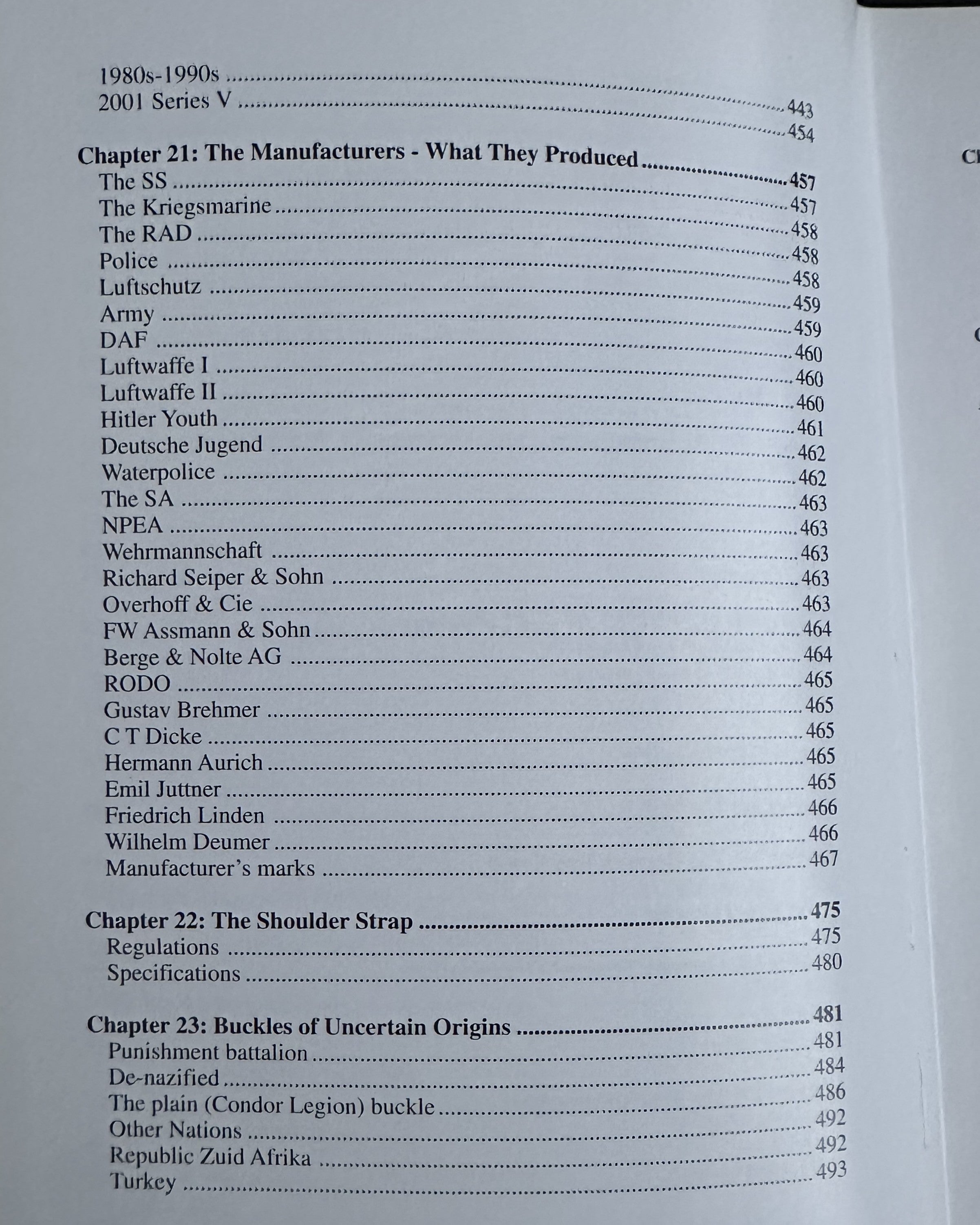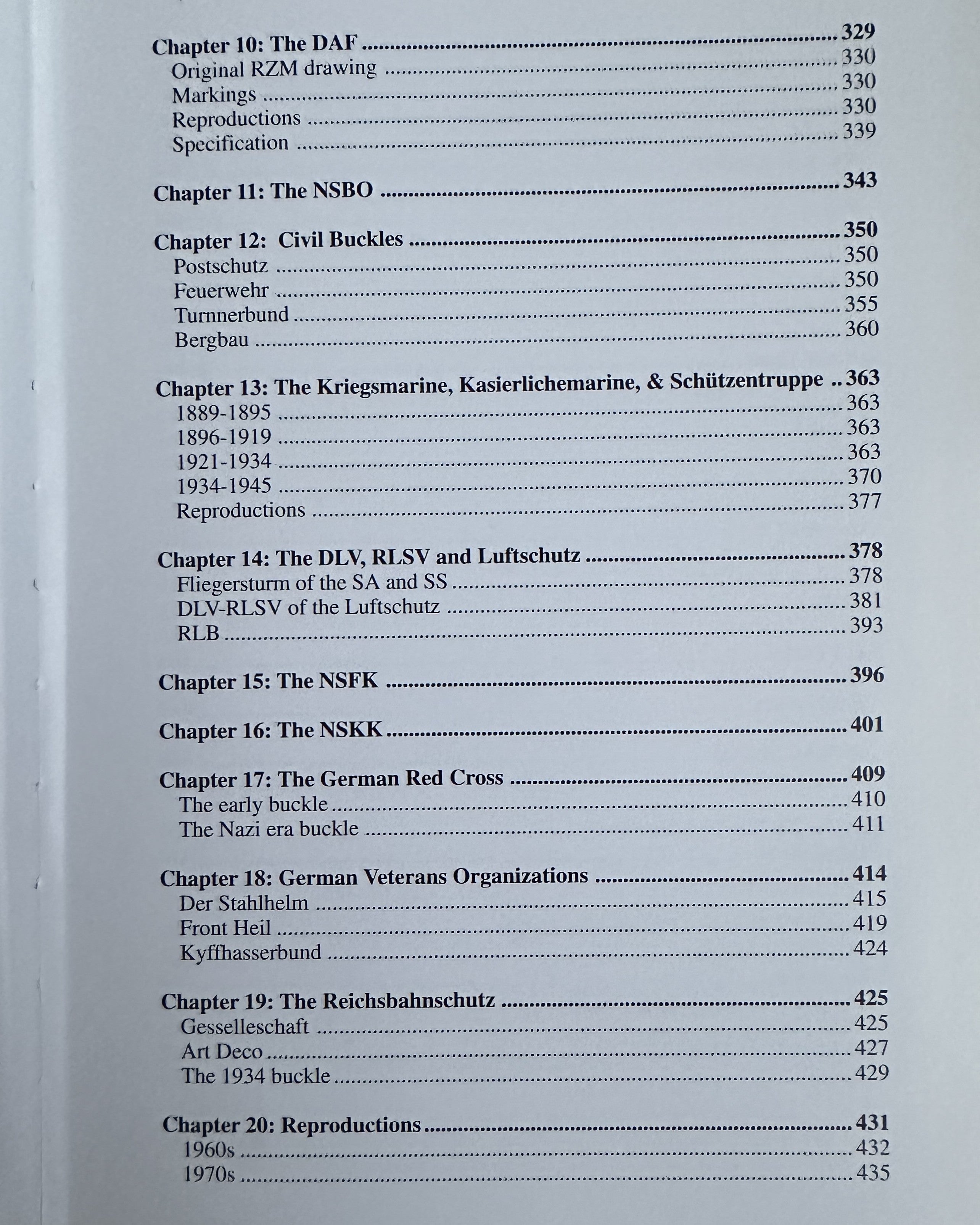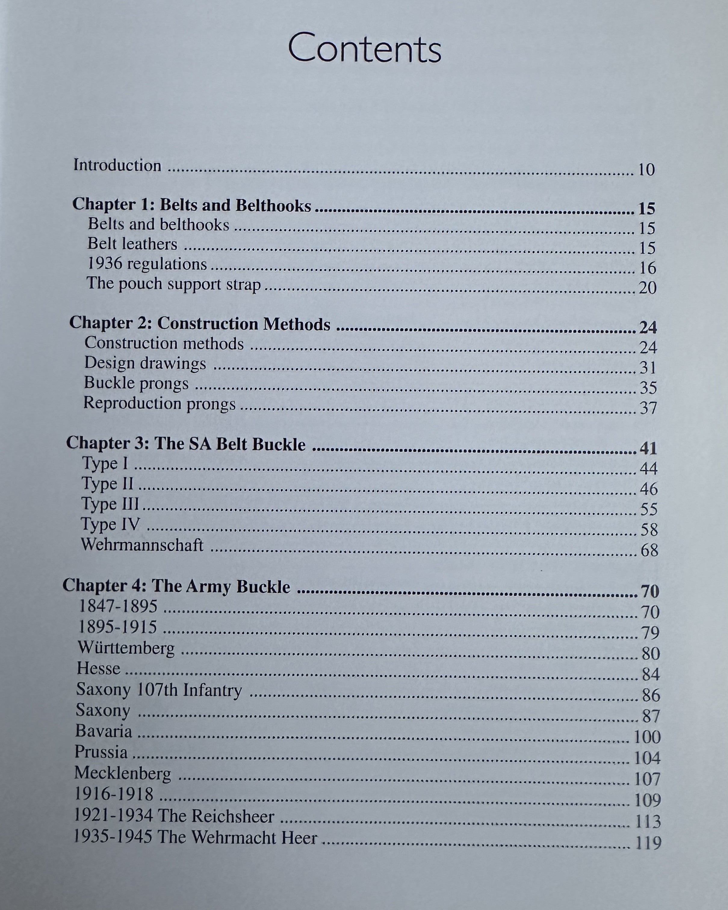 The interior photos confirm a meticulously structured reference work. The contents pages illustrate the scope: early belts and belthooks, construction methods, detailed typology of SA buckles, an extensive chapter devoted to the Imperial and Reichsheer buckles through 1916–1918, and dedicated studies of buckles for Württemberg, Hesse, Saxony, Bavaria, Prussia, and Mecklenberg. The Wehrmacht chapters cover both aluminum and steel buckles, including early die-struck examples, late-war simplifications, tropical variants, and the full range of manufacturing differences observable between Linden & Funke, Juttner, Assmann, Aurich, and other known makers.