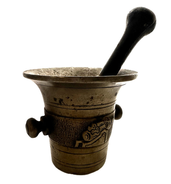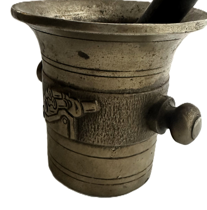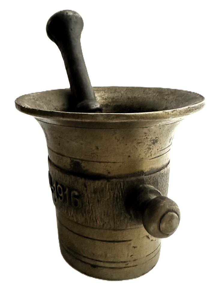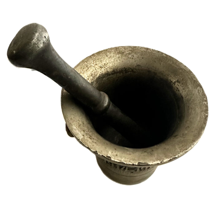 Condition: The mortar and pestle show signs of age and use, consistent with their historical period. The brass has developed a patina, giving it an authentic vintage appearance. There are minor scratches and dents, which add to the item's character and authenticity.