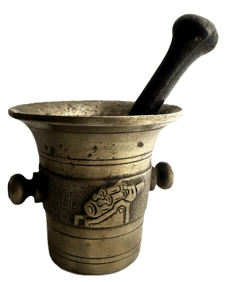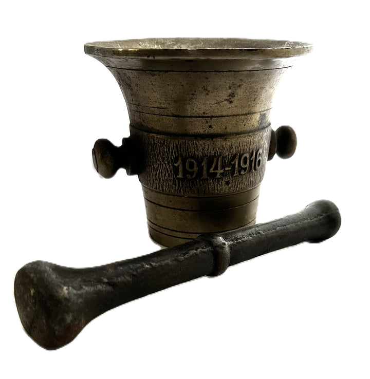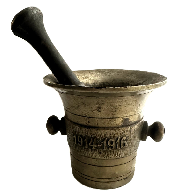 Historical Context: During World War I, items such as this mortar and pestle were often crafted from spent artillery shells and other brass remnants from the battlefield. These "trench art" pieces were typically made by soldiers or local artisans and served as mementos of the war.