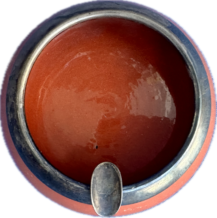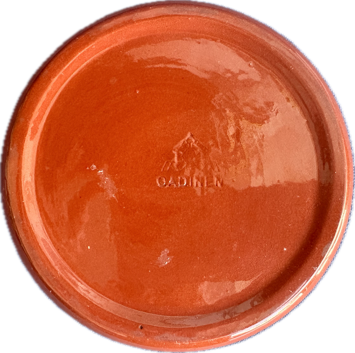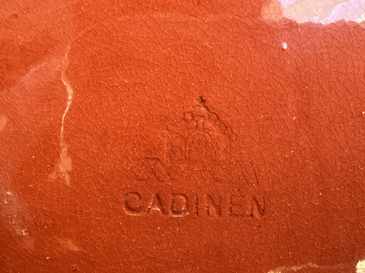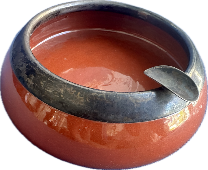 Design and Materials: This piece is crafted in a distinct reddish-brown glazed ceramic, featuring a smooth finish typical of Cadinen wares. The ceramic body is framed with a sturdy metal rim, adding durability and a touch of elegance. The metal rim is believed to have been designed to prevent wear and tear during use. The ashtray has a concave center, with a dedicated notch for resting cigars or cigarettes, maintaining both functionality and style.