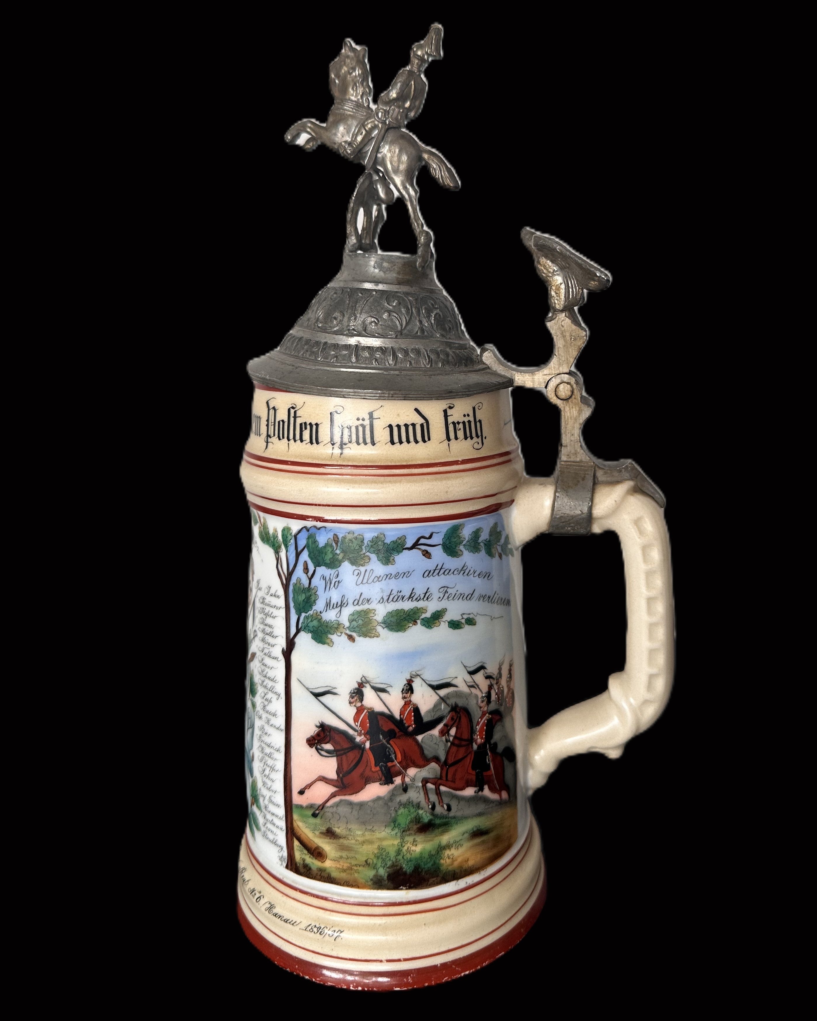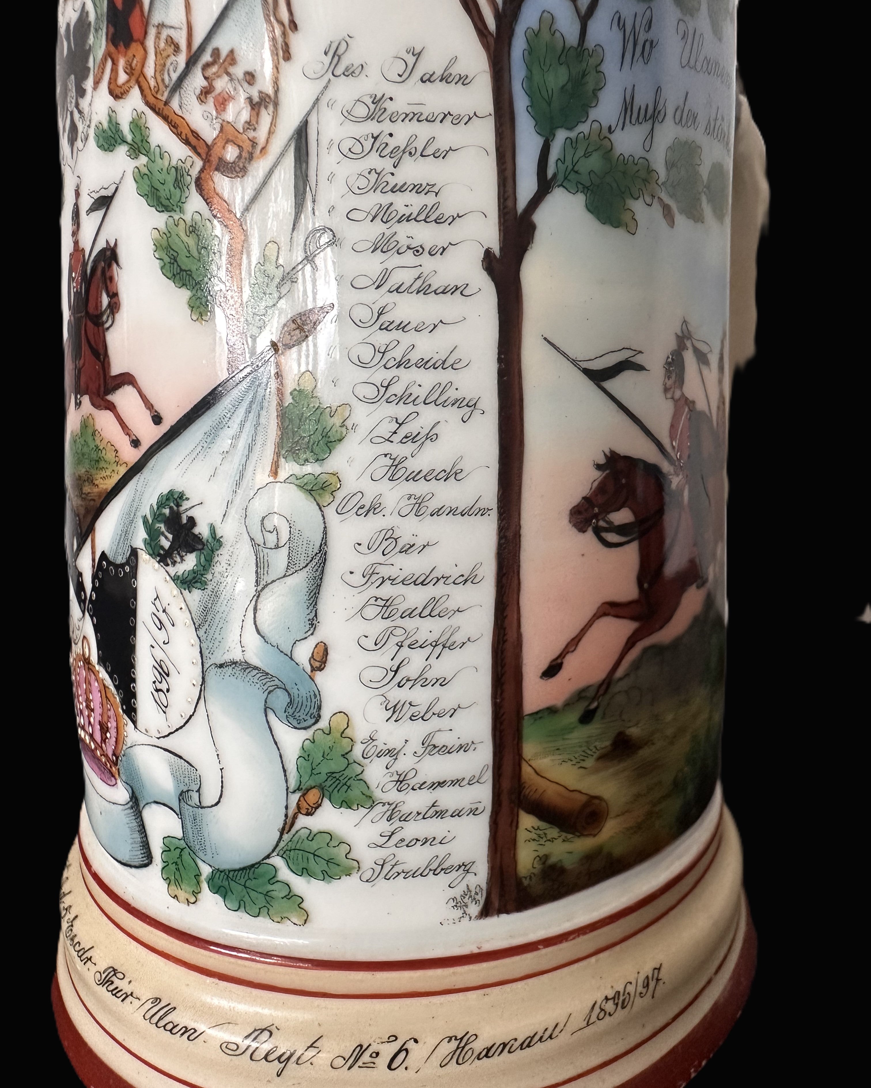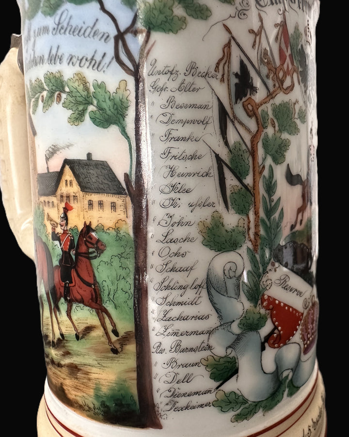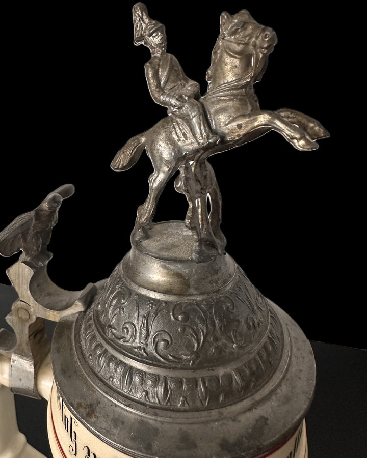 - Commemorative Inscription: The stein is inscribed with “Stolz zu Ross die Kanone” (Proud on Horseback with the Cannon) and features detailed lists of regimental names and ranks.