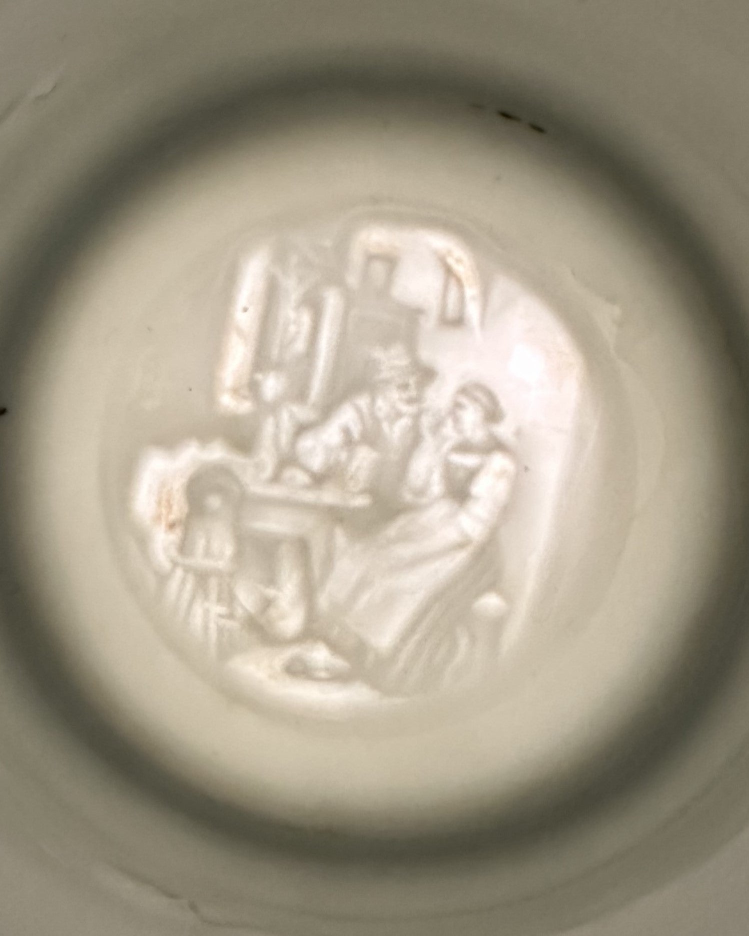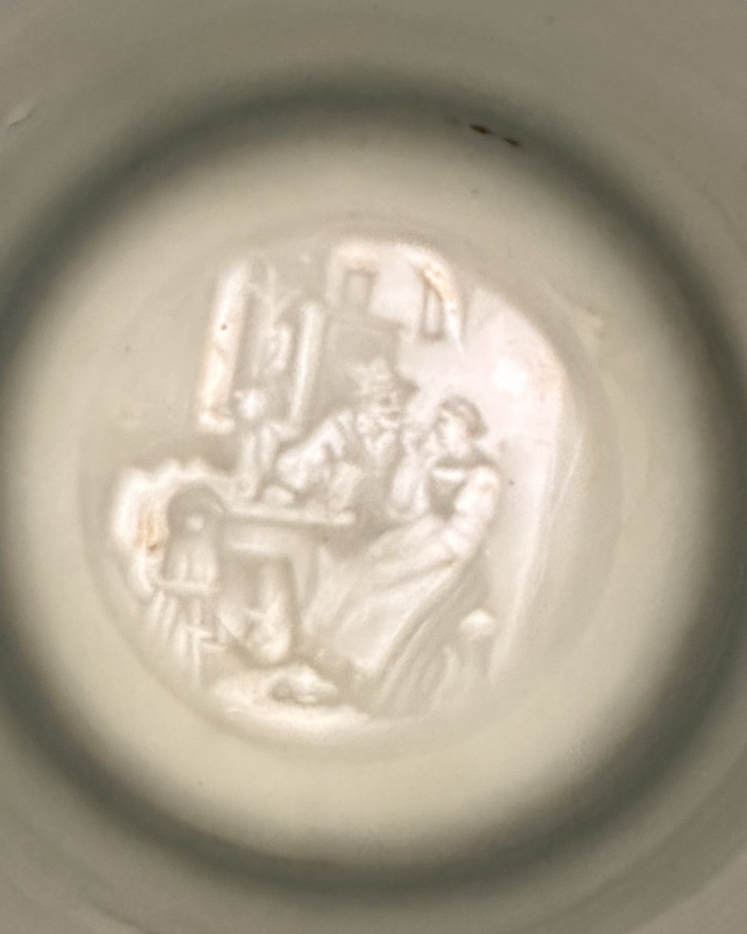 - Interior Detail: A lithophane base, viewable when held to the light, depicting a romantic tavern scene—a hallmark of quality craftsmanship.