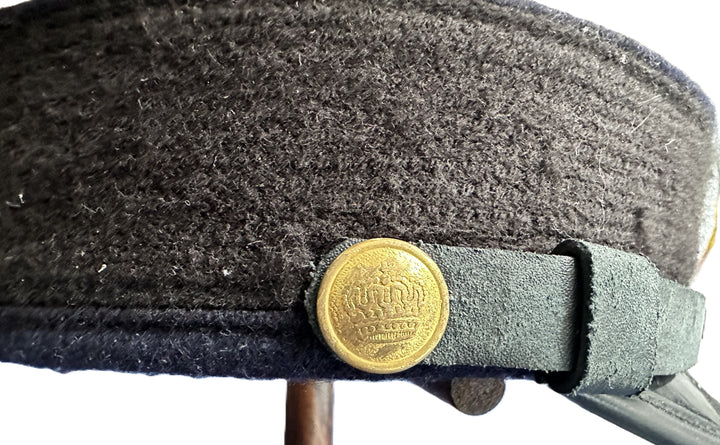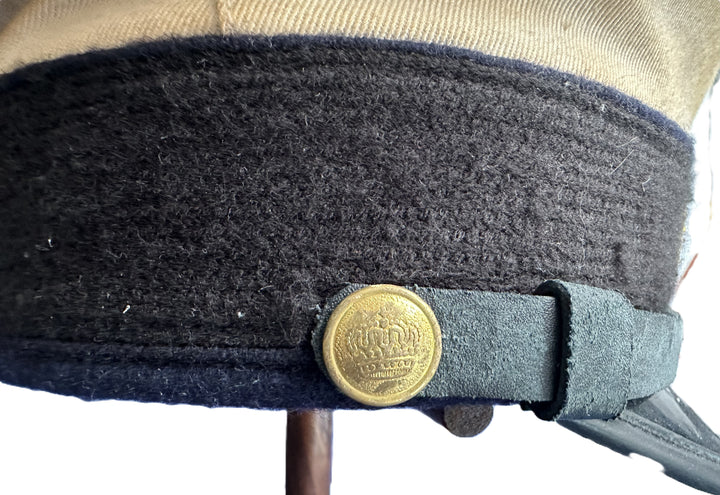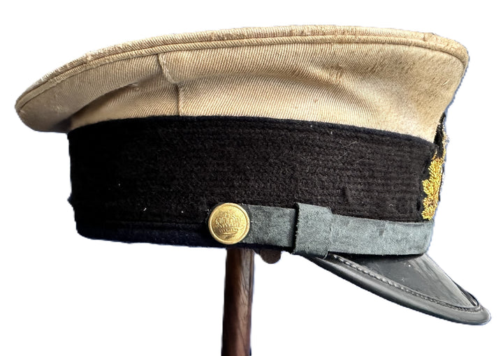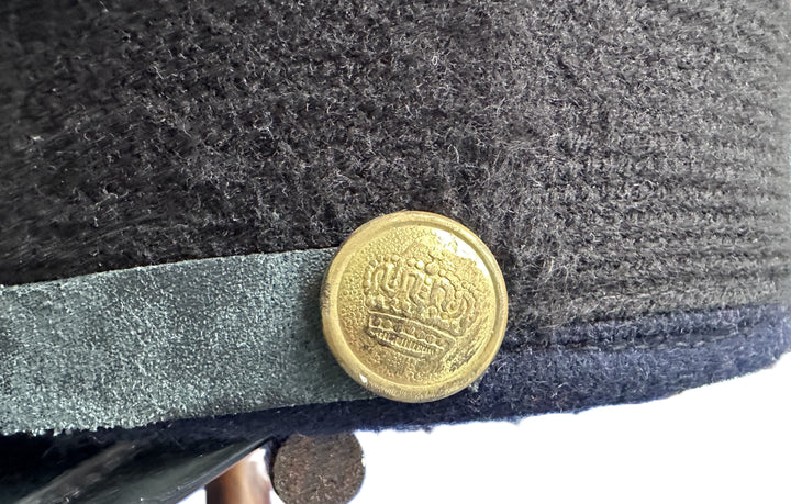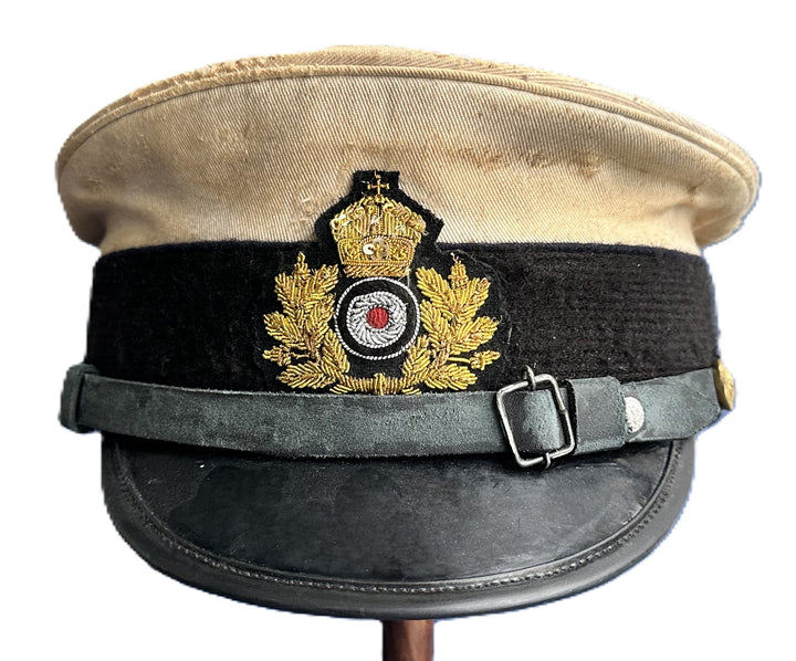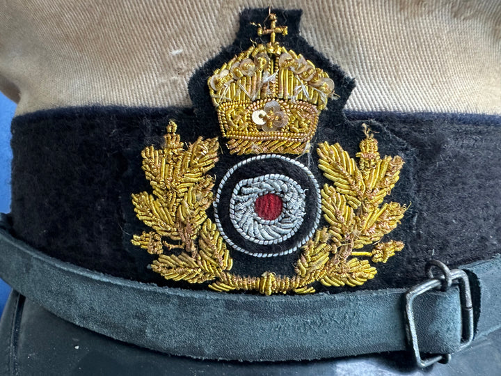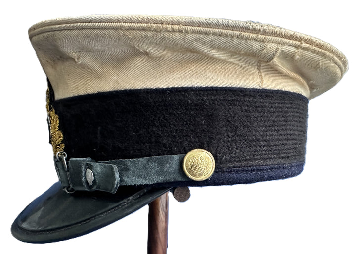 This cap represents the iconic headgear worn by Imperial German Navy officers during the early 20th century, specifically prior to and during World War I. The German Imperial Navy, under Kaiser Wilhelm II’s reign, played a crucial role in maritime conflicts and imperial ambitions, especially during the naval arms race against Great Britain. Officers' caps like this were symbols of authority and rank, often adorned with detailed insignia.