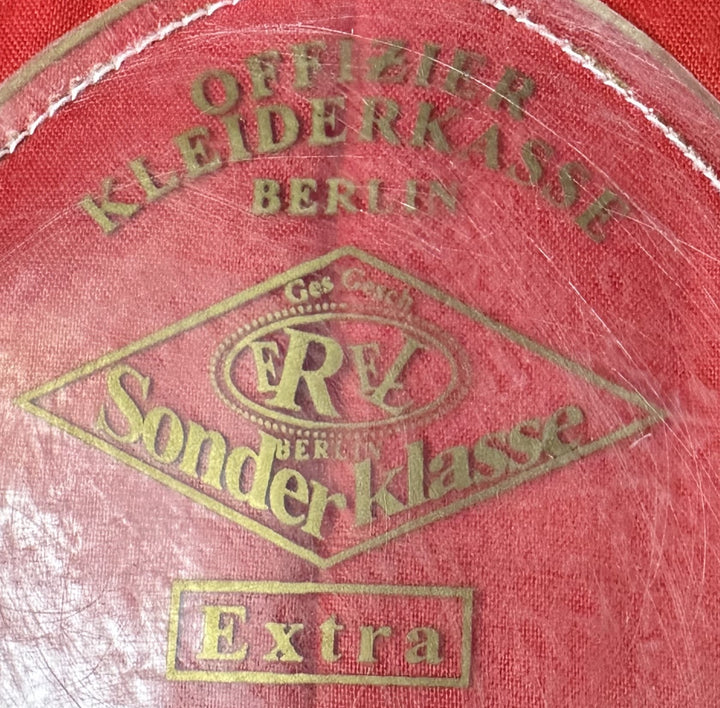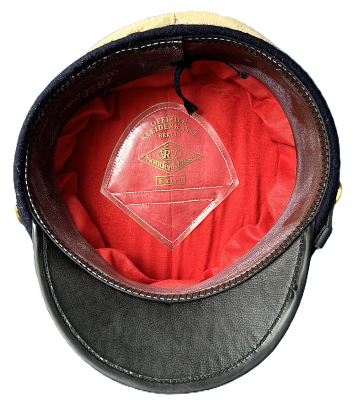 The interior of the cap has a red silk lining with an intact manufacturer’s mark, "Offizier Kleiderkasse Berlin", signifying that it was a private purchase from the officers' uniform supply store. The maker’s mark is also stamped “Sonderklasse Extra” in gold, indicating a higher-quality version meant for officers of distinguished rank. The sweatband is made from black leather and shows signs of historical wear, adding to its authenticity.