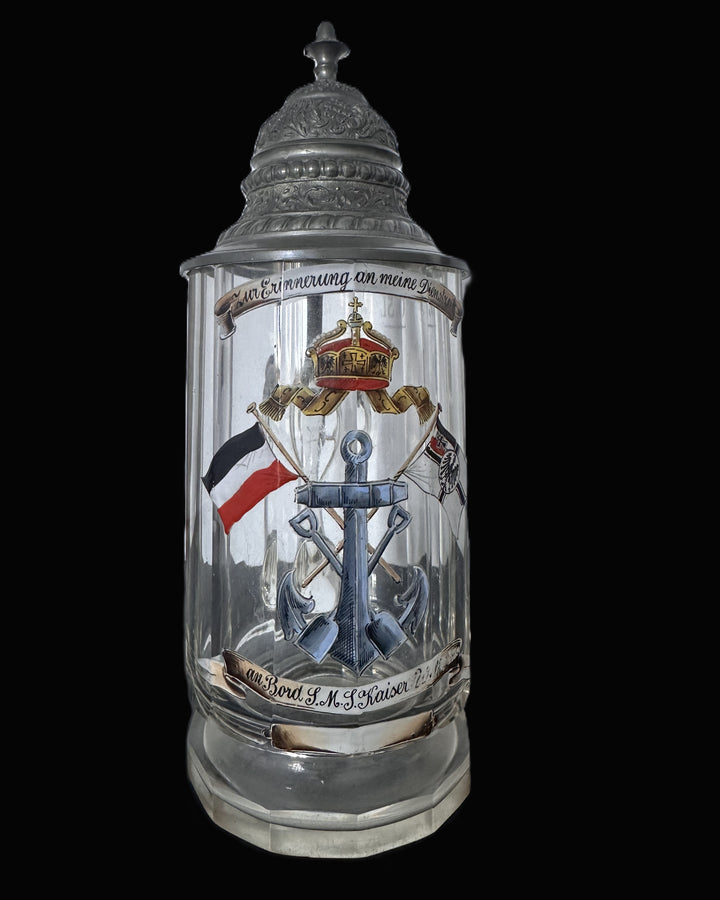 This stein is believed to have belonged to a sailor aboard the SMS Kaiser Wilhelm II, likely commissioned as a personal memento or commemorative gift.