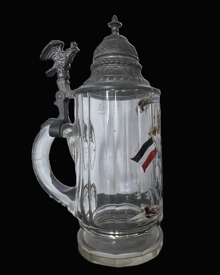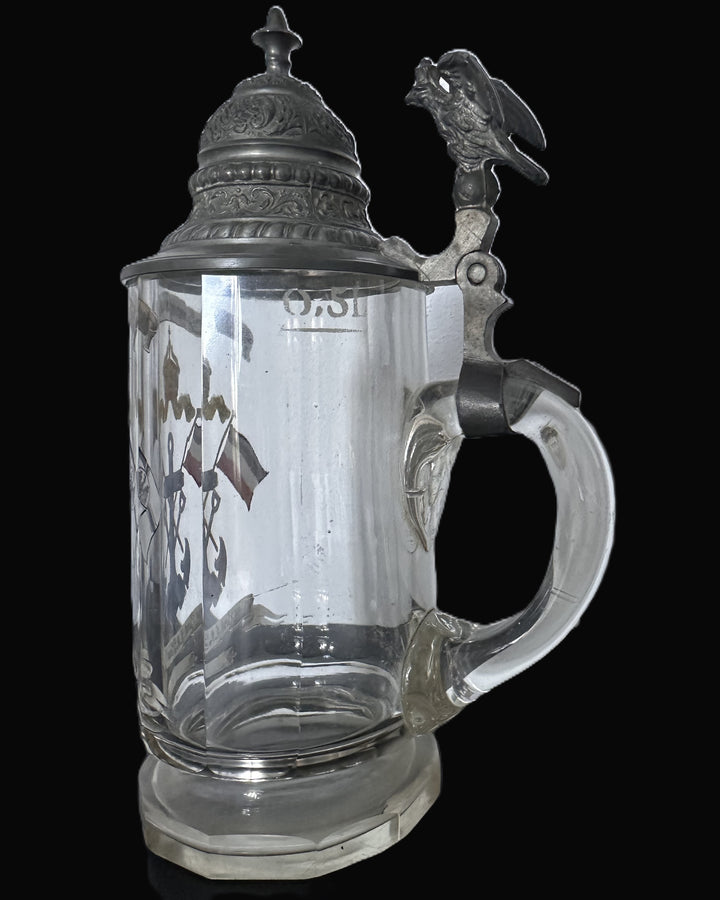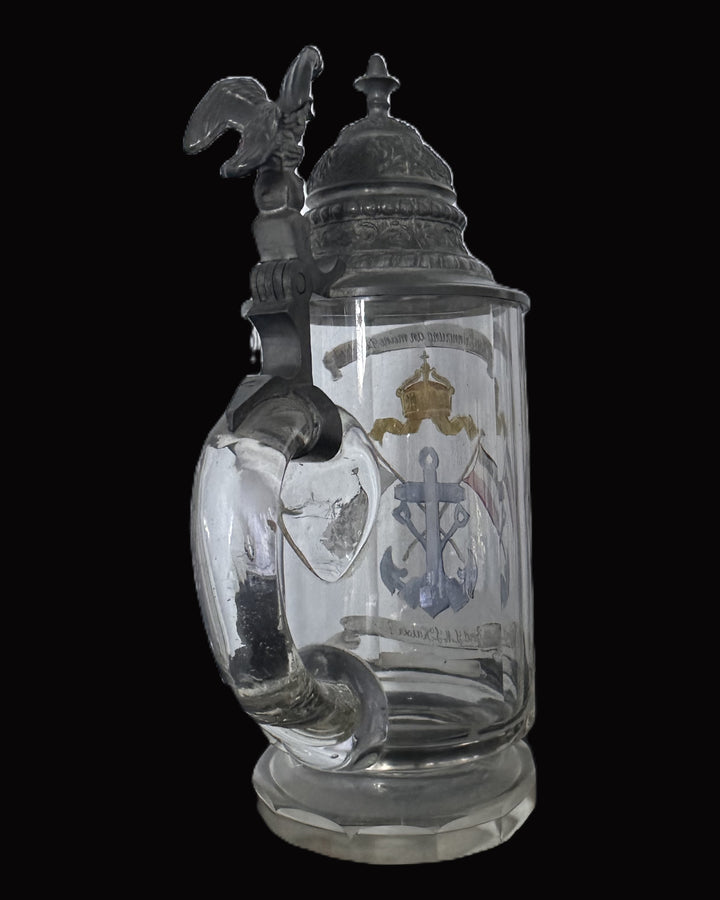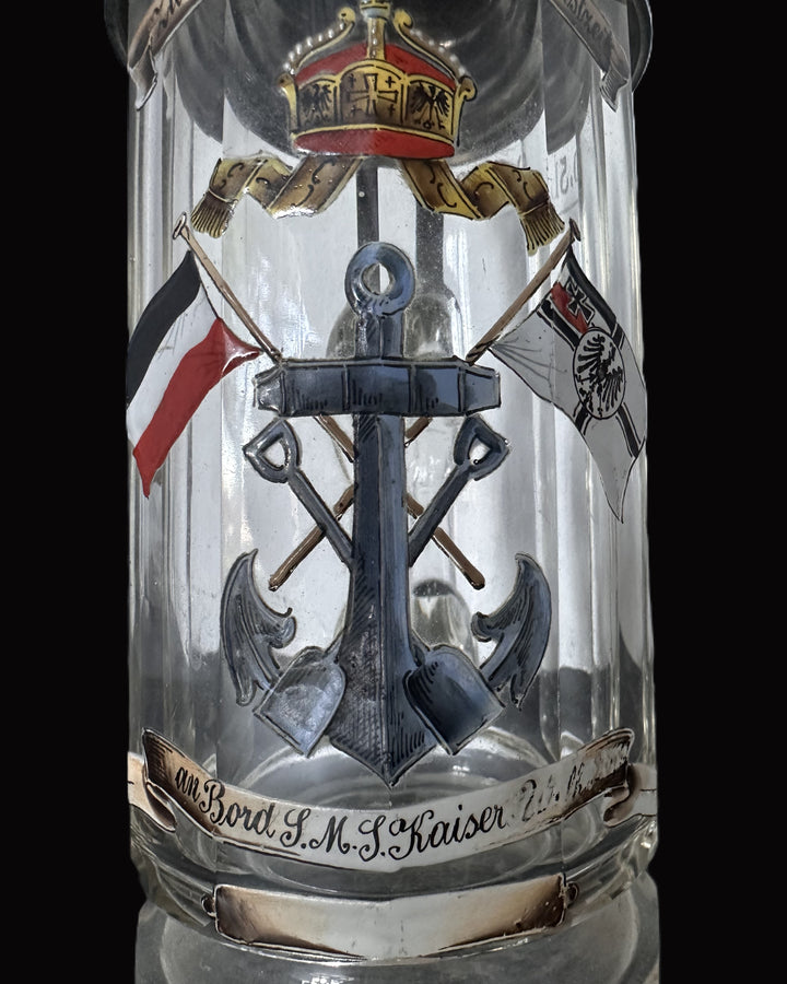 The body of the stein is made of heavy, faceted glass with fluted detailing. The vibrant enamel artwork showcases an anchor crossed by naval flags, crowned by the German Imperial crown. Below the centerpiece, the inscription reads: “An Bord S.M.S. Kaiser Wilhelm II.”, translating to "Onboard His Majesty's Ship Kaiser Wilhelm II," commemorating a sailor's service on this legendary warship.