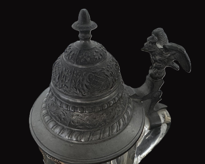 - Pewter Lid: The stein’s ornate domed pewter lid features detailed repoussé designs, including floral motifs and scrollwork. It is crowned by a finial that adds an elegant touch of grandeur.