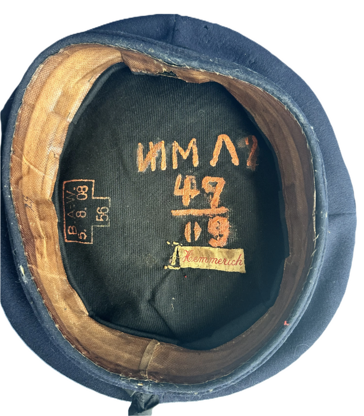 This cap appears to be in original condition, showing light signs of use and age, which add to its authenticity. The presence of personal identification inside the cap offers an additional layer of provenance. It is a rare piece, representative of its era.