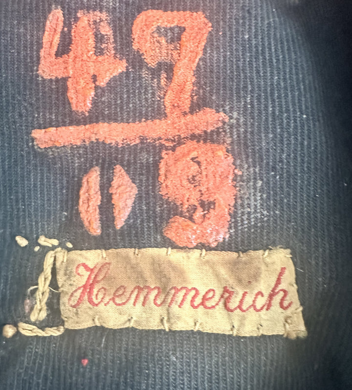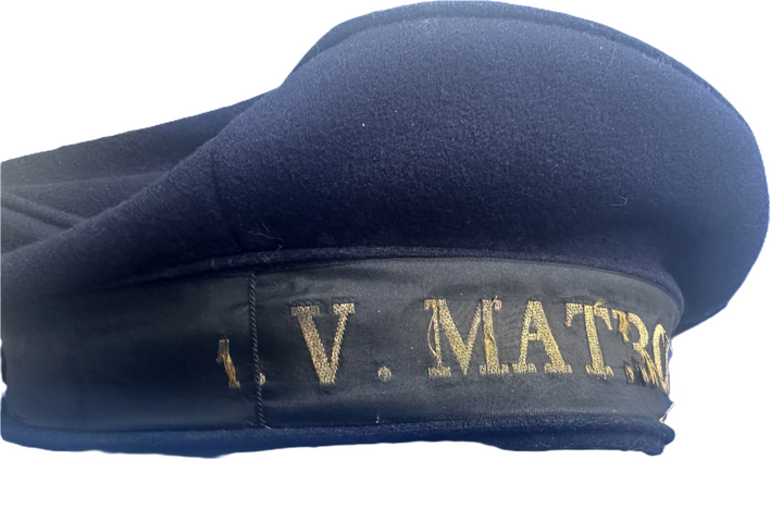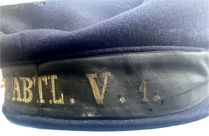 - Materials: The cap is made of navy-blue wool, typical for sailor’s uniforms, with a black ribbon or tally displaying gold embroidery. The interior features markings and the maker’s label, Hemmerich.