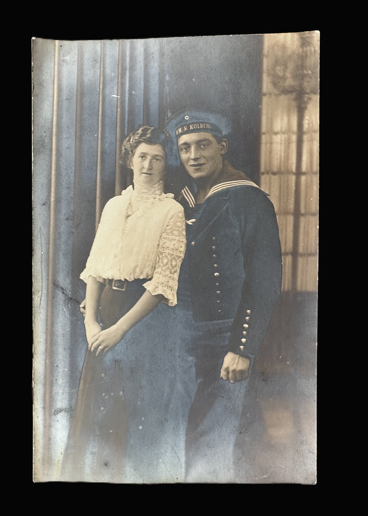 The SMS Kolberg was a light cruiser launched in 1908 and part of the Imperial German Navy’s fleet. Serving during World War I, the Kolberg was notable for its role in reconnaissance and fleet operations. Such photographs were commonly taken by sailors before deployment or during leave, capturing moments of connection with loved ones amidst the backdrop of duty during turbulent times.