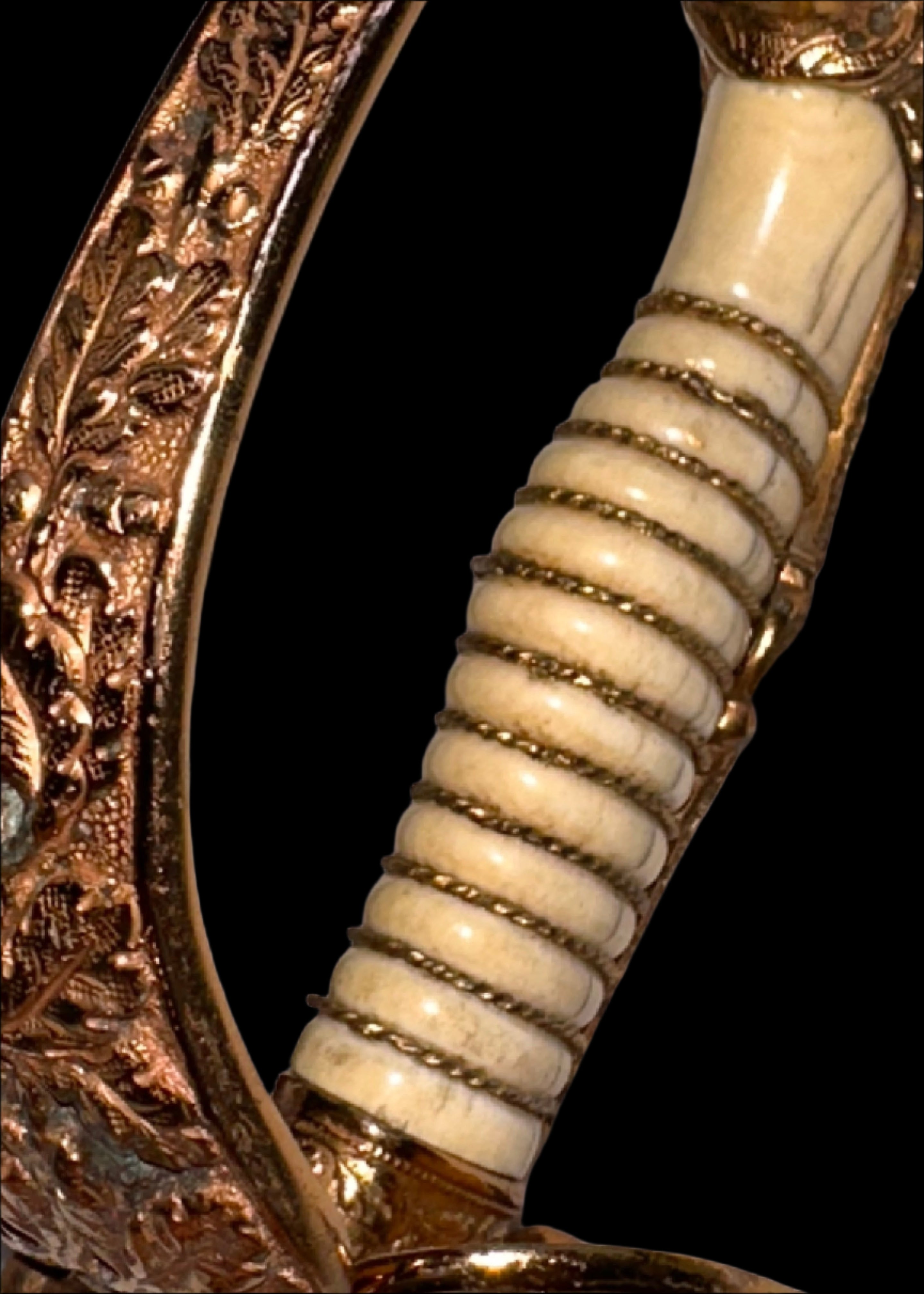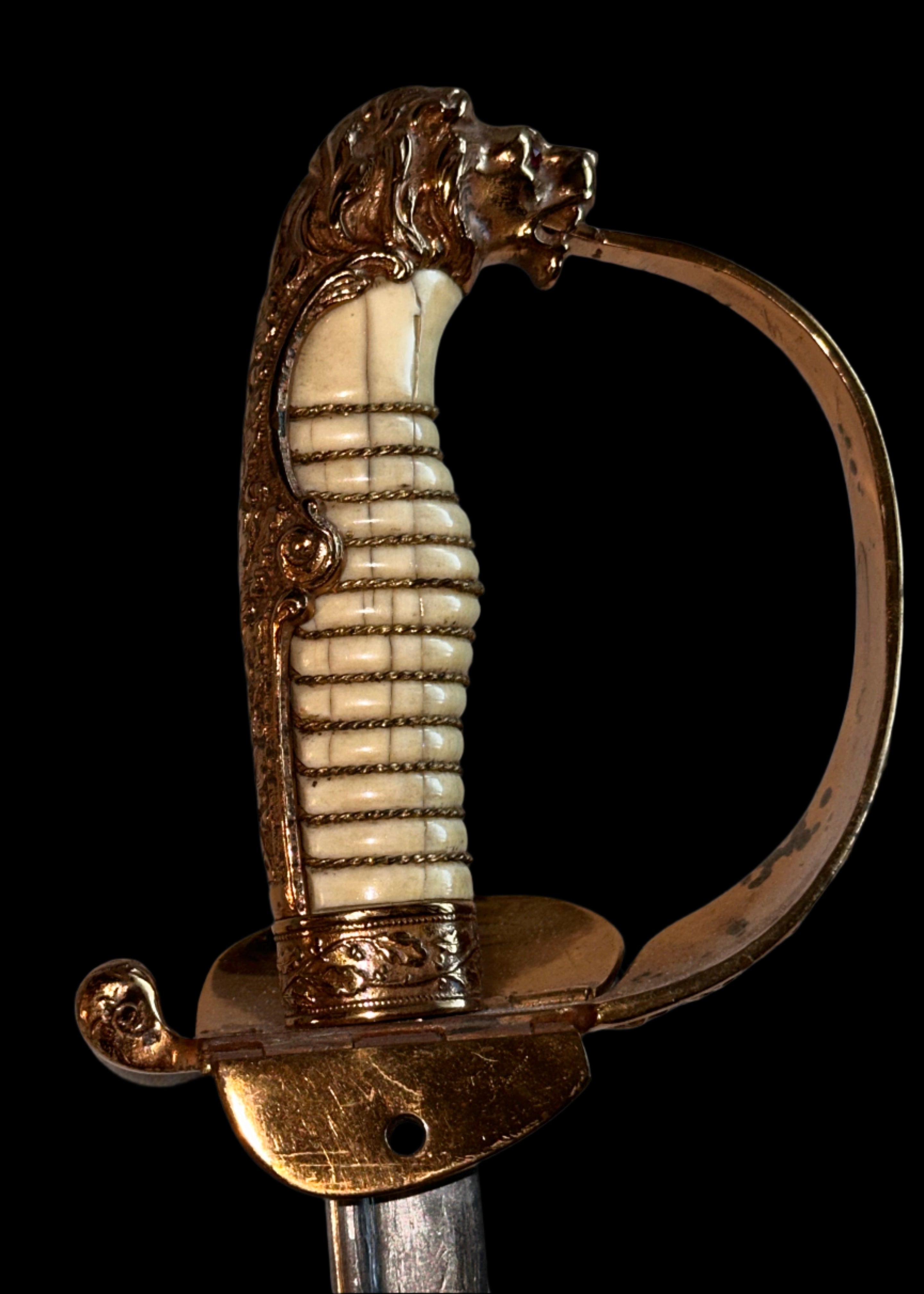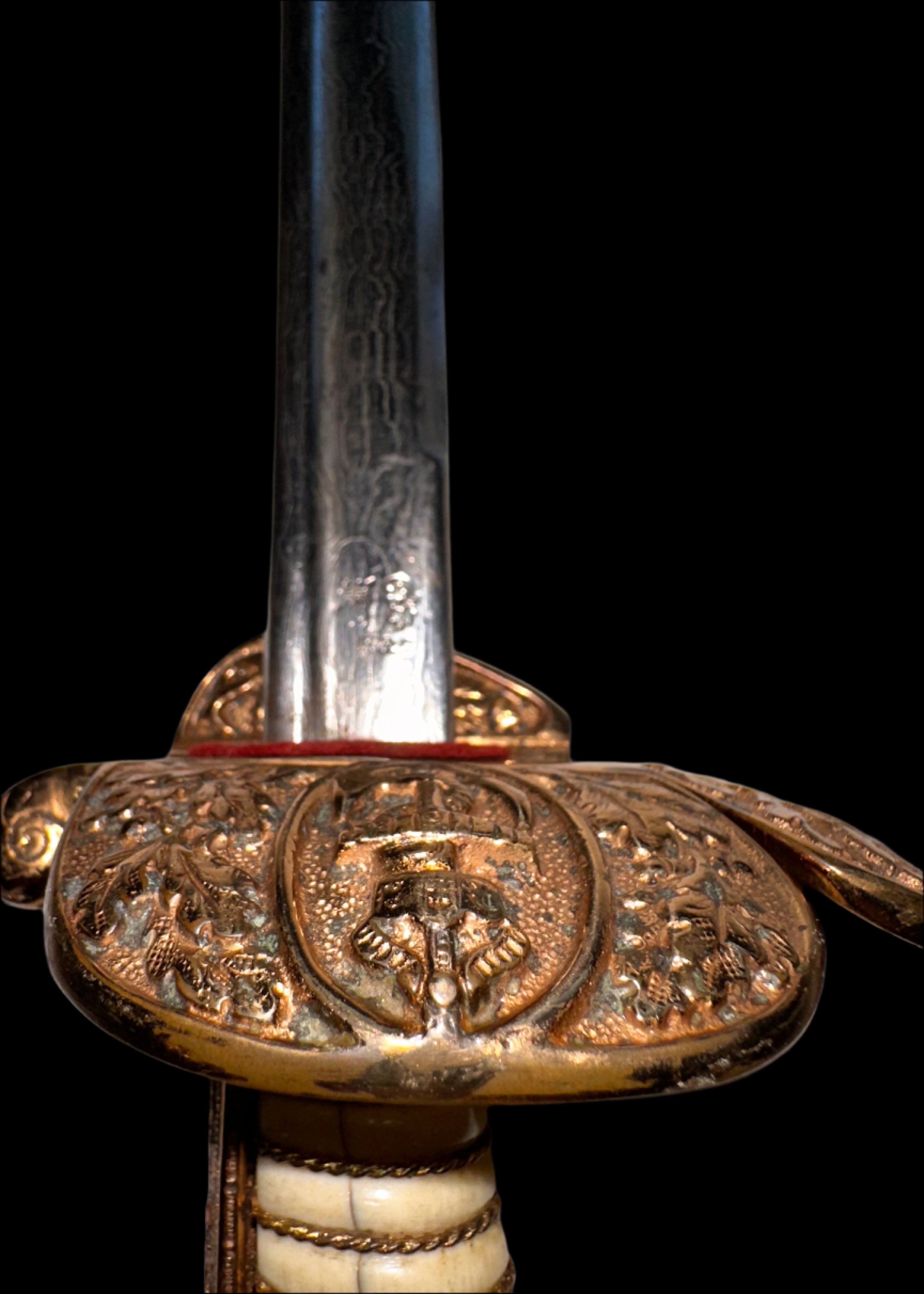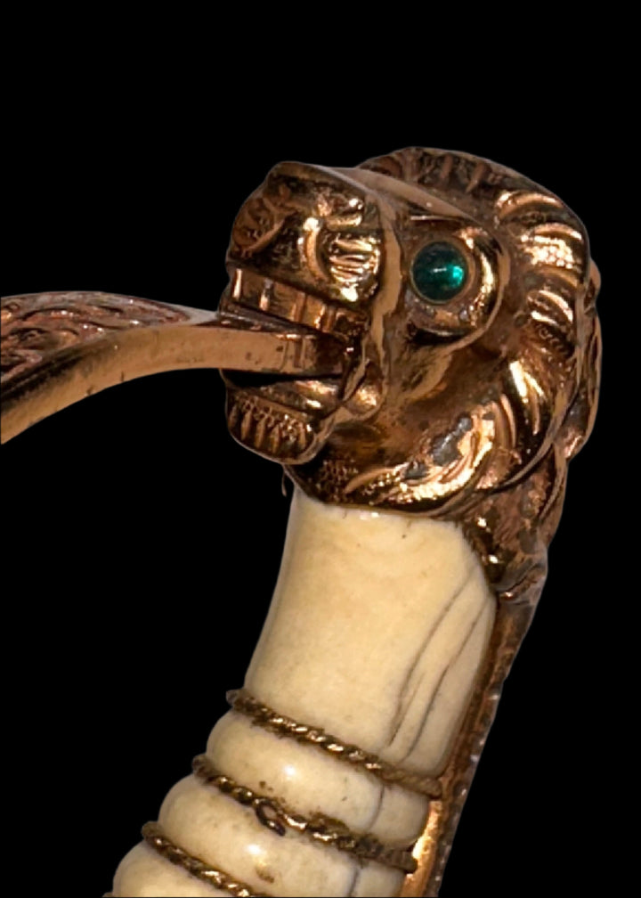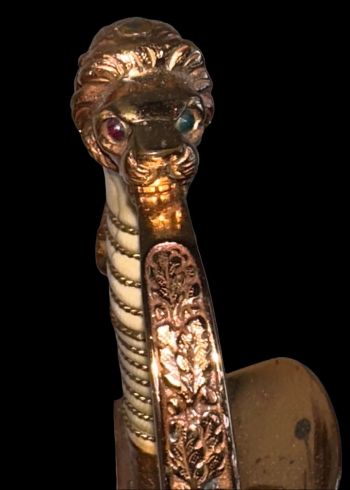 The sword’s grip is fashioned from genuine ivory and remains in very good condition with visible age-toning, natural grain, and no cracks or breaks. The twisted wire wrap is intact and tightly wound. Capping the grip is a fire-gilded brass lion-head pommel. Its eyes are adorned with mismatched cabochon gemstones—one red, the other green—adding a slightly eccentric but authentic flair. This is not a flaw, but a known detail sometimes found on custom commissions or personal replacements.