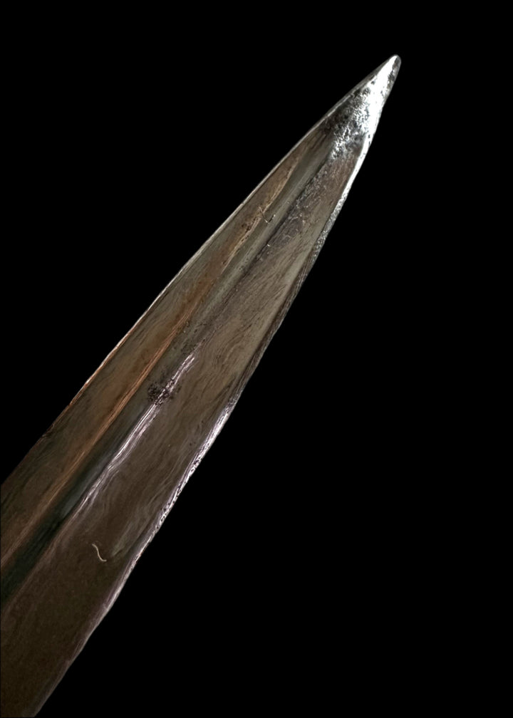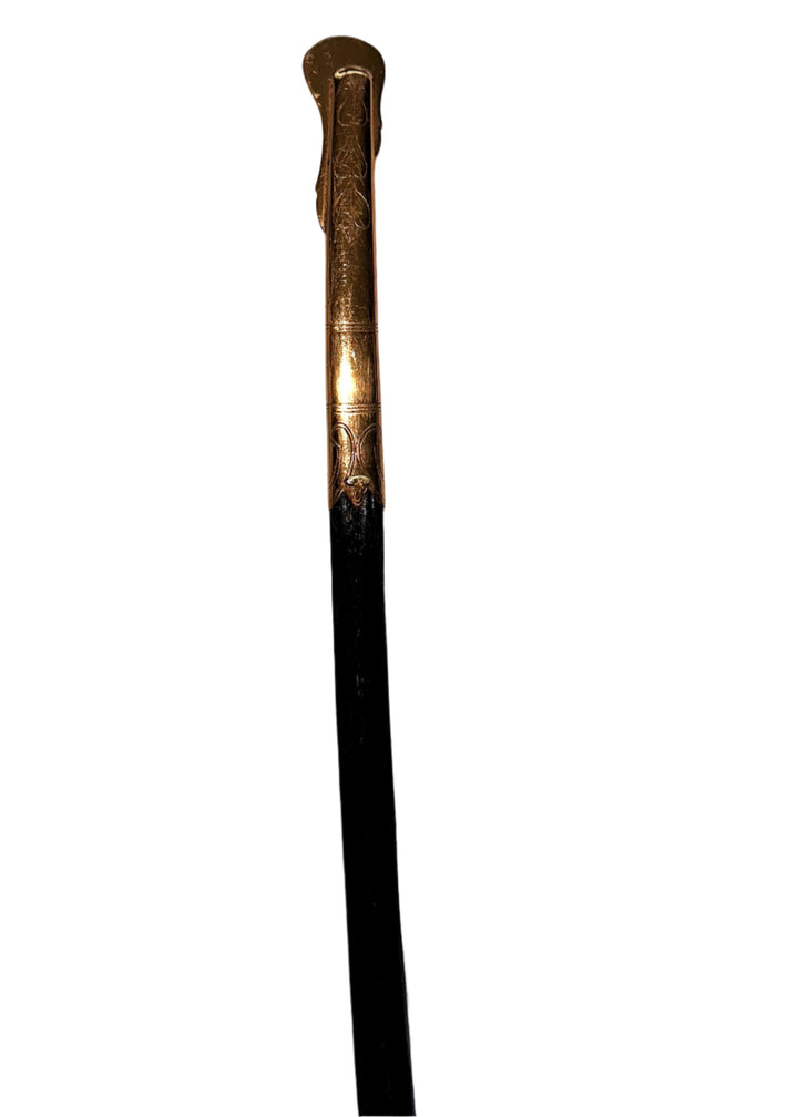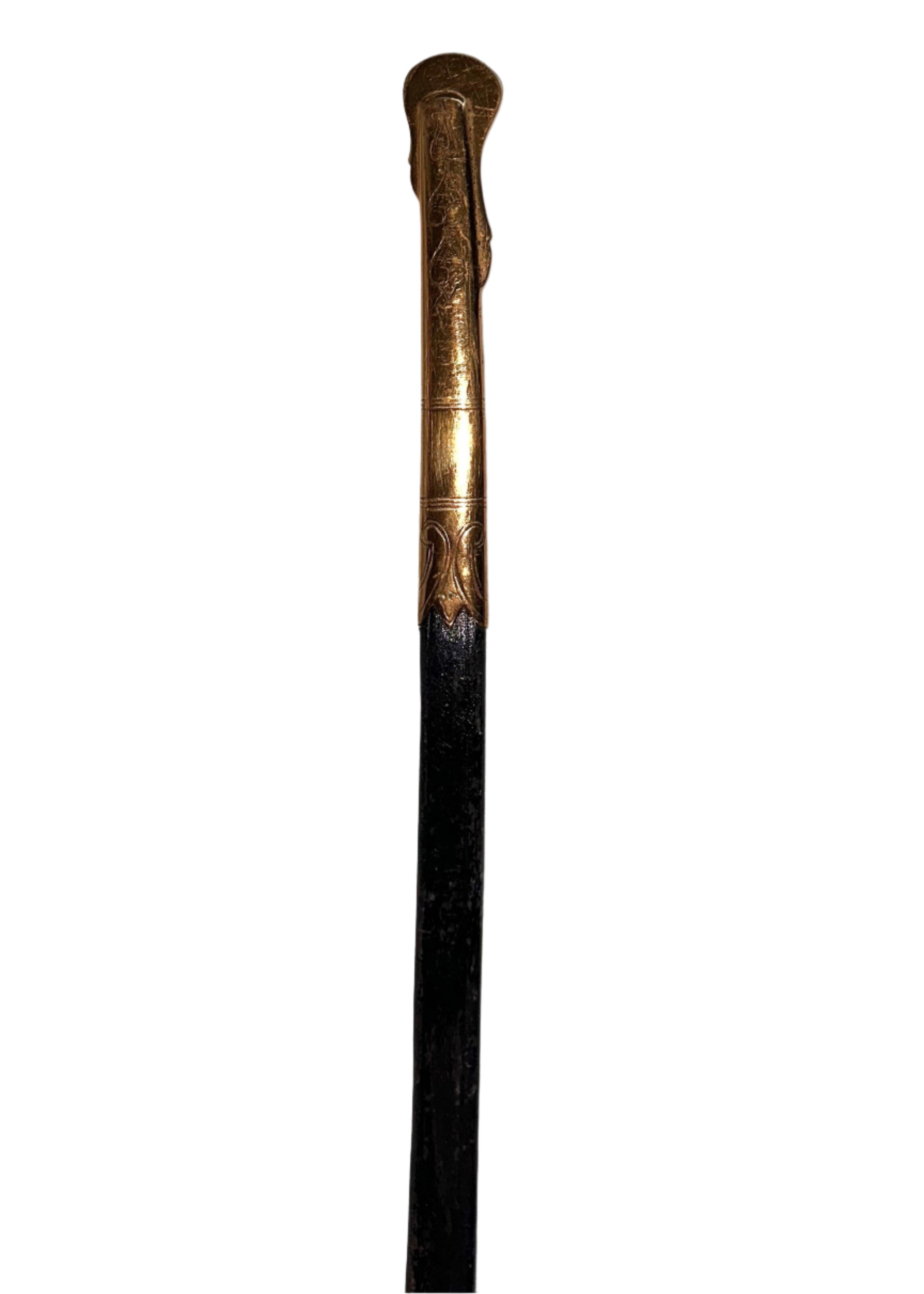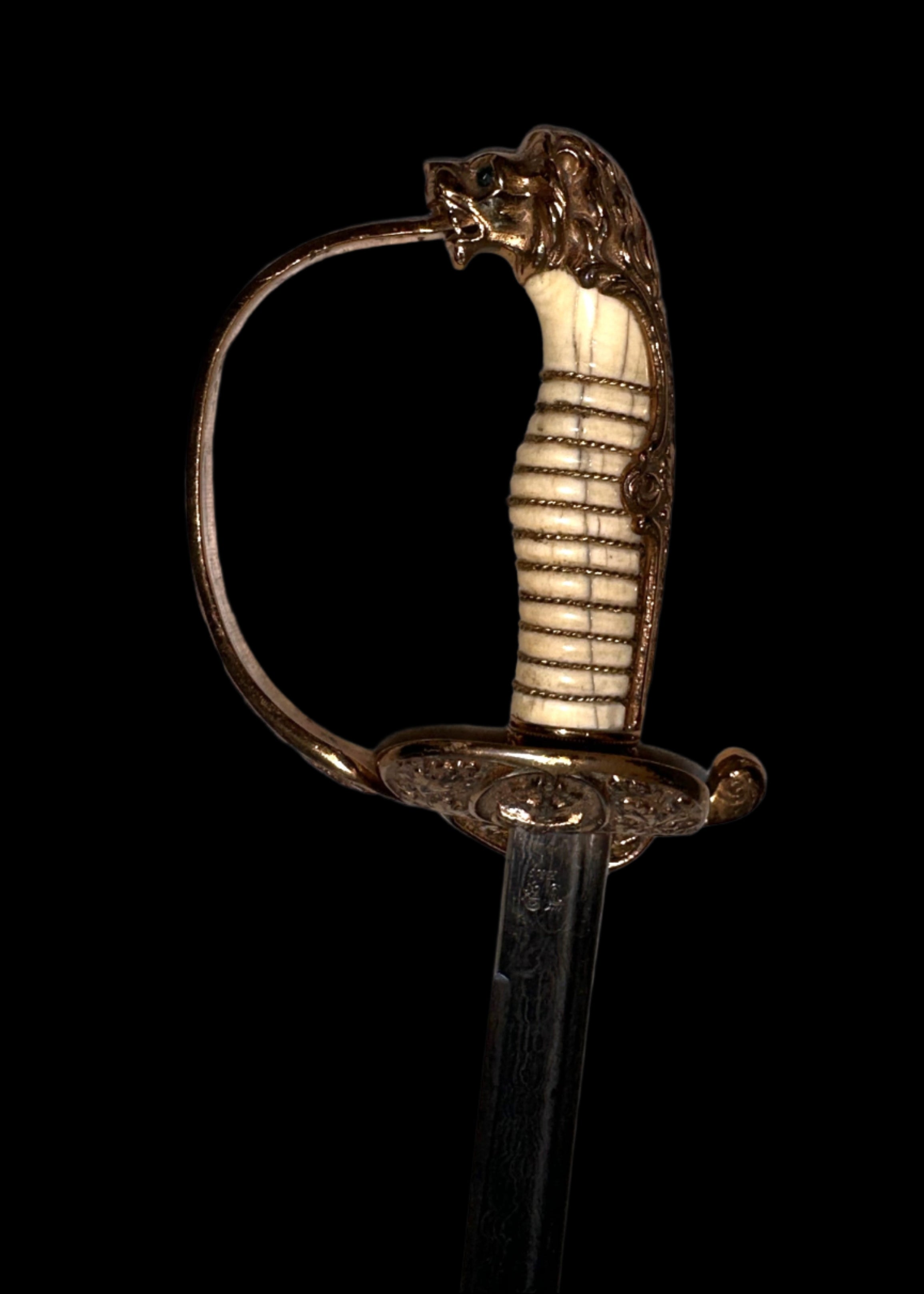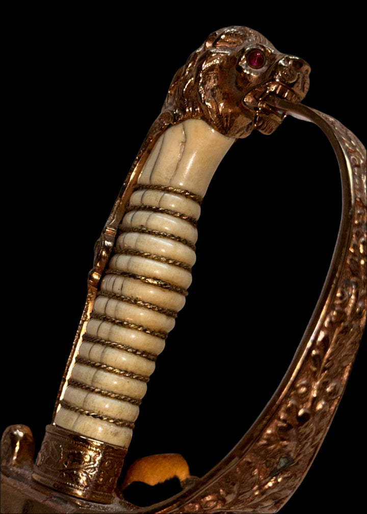 The sword’s grip is fashioned from genuine ivory and remains in very good condition with visible age-toning, natural grain, and no cracks or breaks. The twisted wire wrap is intact and tightly wound. Capping the grip is a fire-gilded brass lion-head pommel. Its eyes are adorned with mismatched cabochon gemstones—one red, the other green—adding a slightly eccentric but authentic flair. This is not a flaw, but a known detail sometimes found on custom commissions or personal replacements.