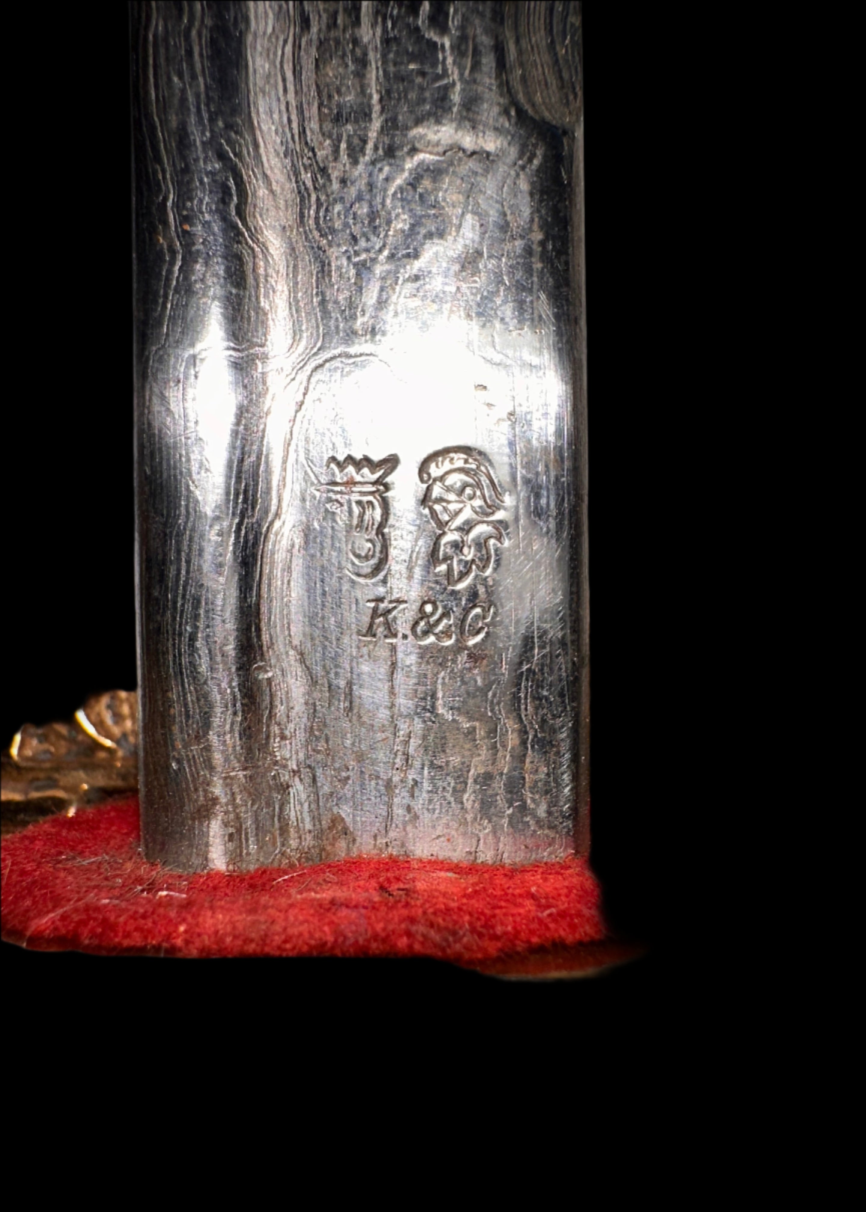 This is a stunning Imperial German officer’s sword featuring a genuine Damascus steel blade and an elaborately gilded brass hilt. It is a high-quality private purchase piece, likely intended for a naval or court officer, manufactured in Solingen and marked "K & C" beneath a crowned “B” and helmeted head maker’s mark. The firm, though lesser known than WKC or Eickhorn, produced finely crafted presentation-grade edged weapons during the Kaiserzeit.
