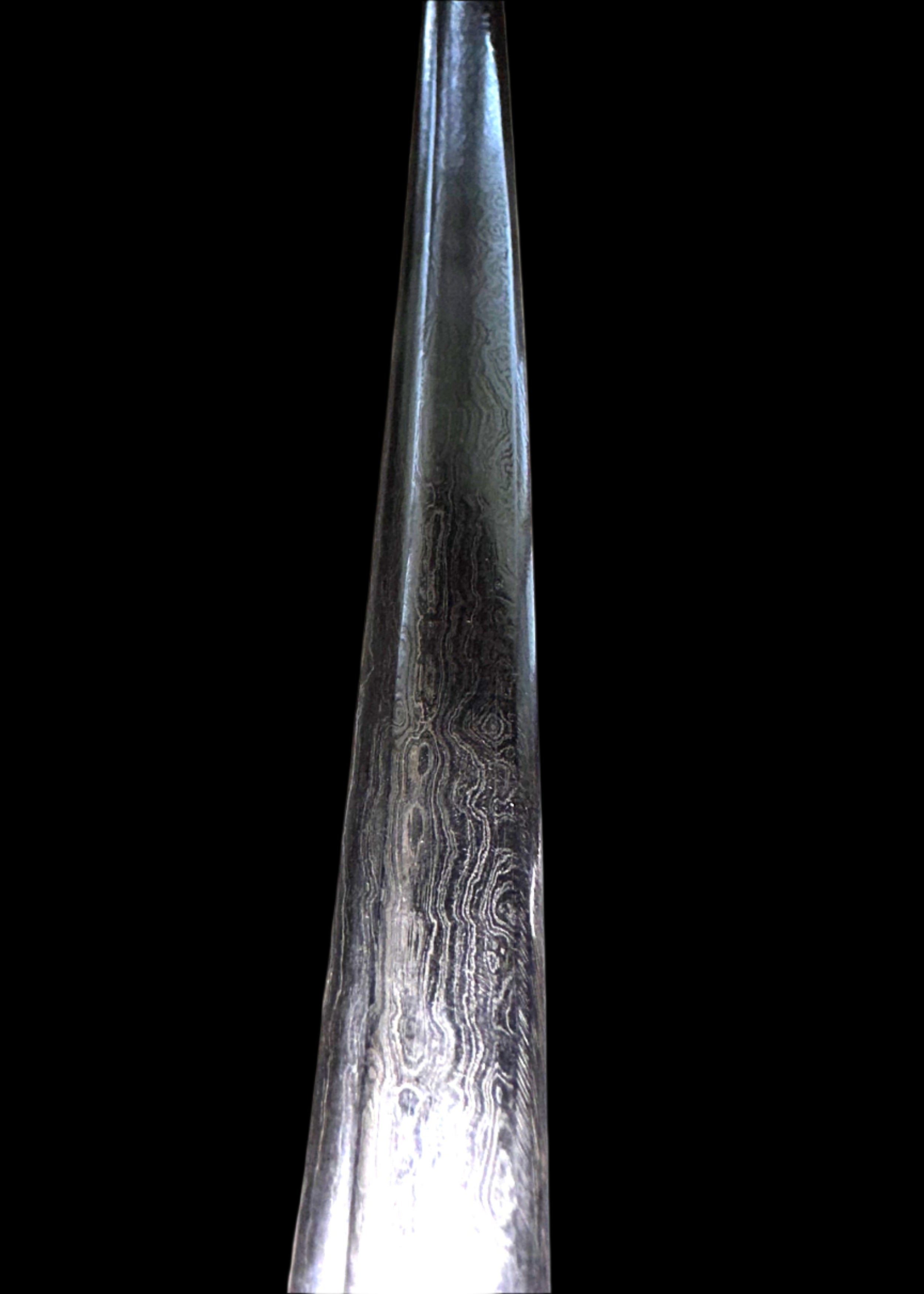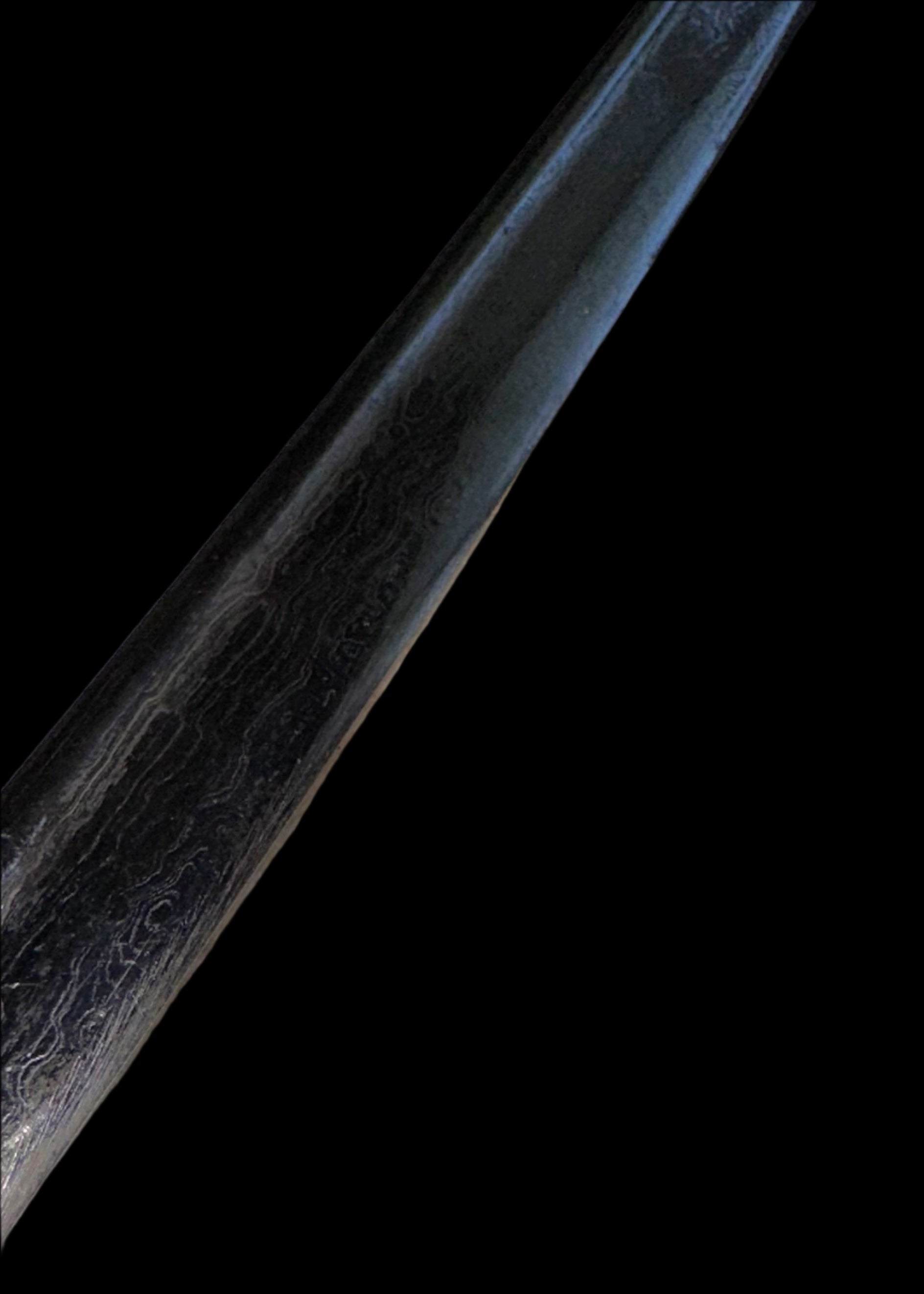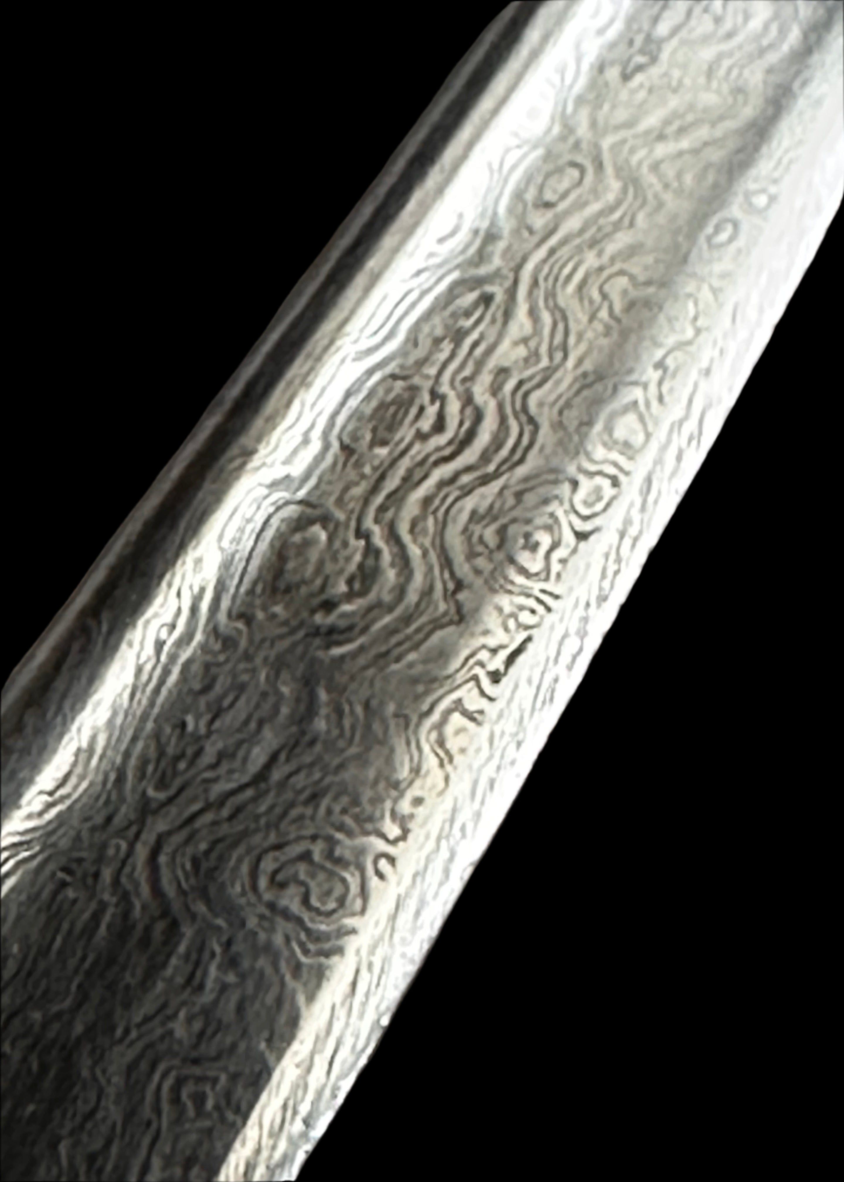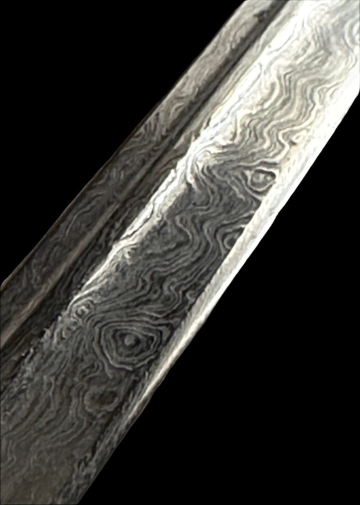 The blade is the true highlight of this sword: a beautifully patterned “Damaststahl” (Damascus steel) blade showing prominent, swirling layers from the forge-welding of multiple types of steel. This pattern remains strong and clearly visible throughout the blade's length. Some minor surface wear and spotting are visible, most notably near the tip, but the integrity and appeal of the blade are entirely intact. A red felt washer is still present at the base of the blade.