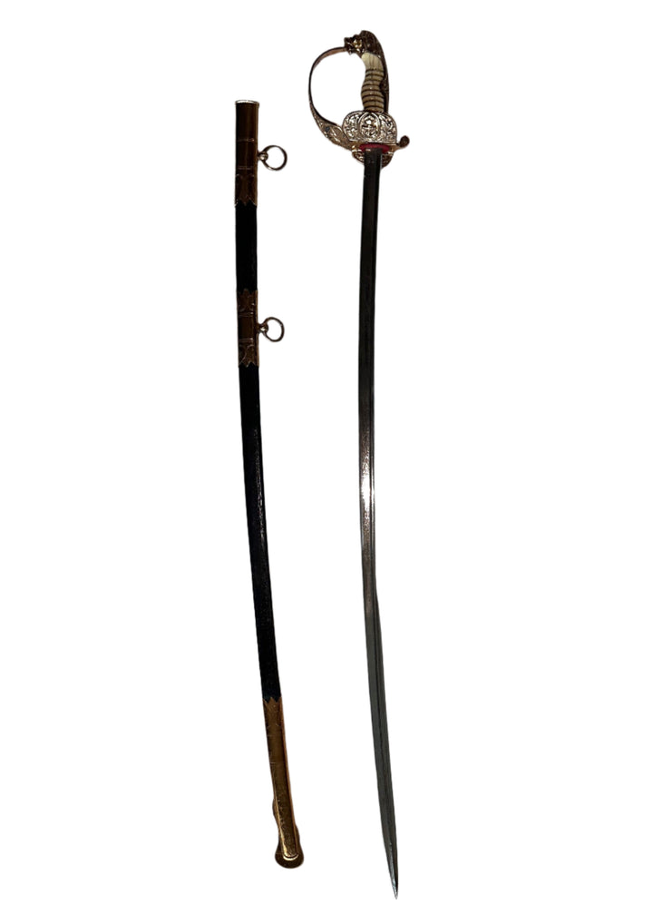 Excellent for display with high collector value. The sword is complete and solid, retaining all key components: ivory grip, Damascus blade, matching scabbard. Minor age wear present (surface oxidation near tip, mild gilding loss, natural grip patina) but no structural issues. A remarkable example of a privately purchased officer’s weapon made to impress both on and off parade.