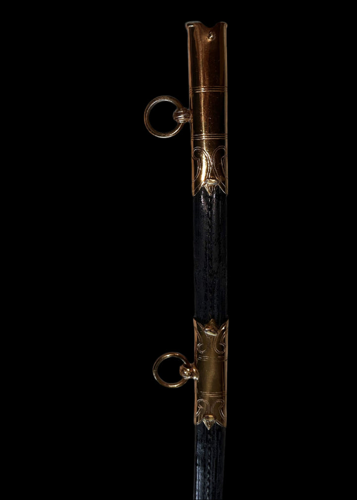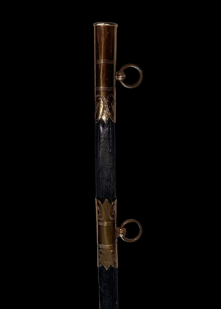 The black leather scabbard features three ornate fire-gilded brass fittings with deeply engraved motifs and floral accents. The top and middle fittings each retain their original suspension rings. The leather body of the scabbard is overall very solid with minimal age-related surface wear and no splitting. The gilded fittings remain in good condition, though there is minor patina consistent with age and use.