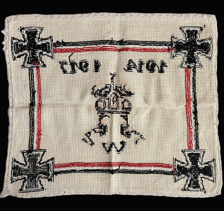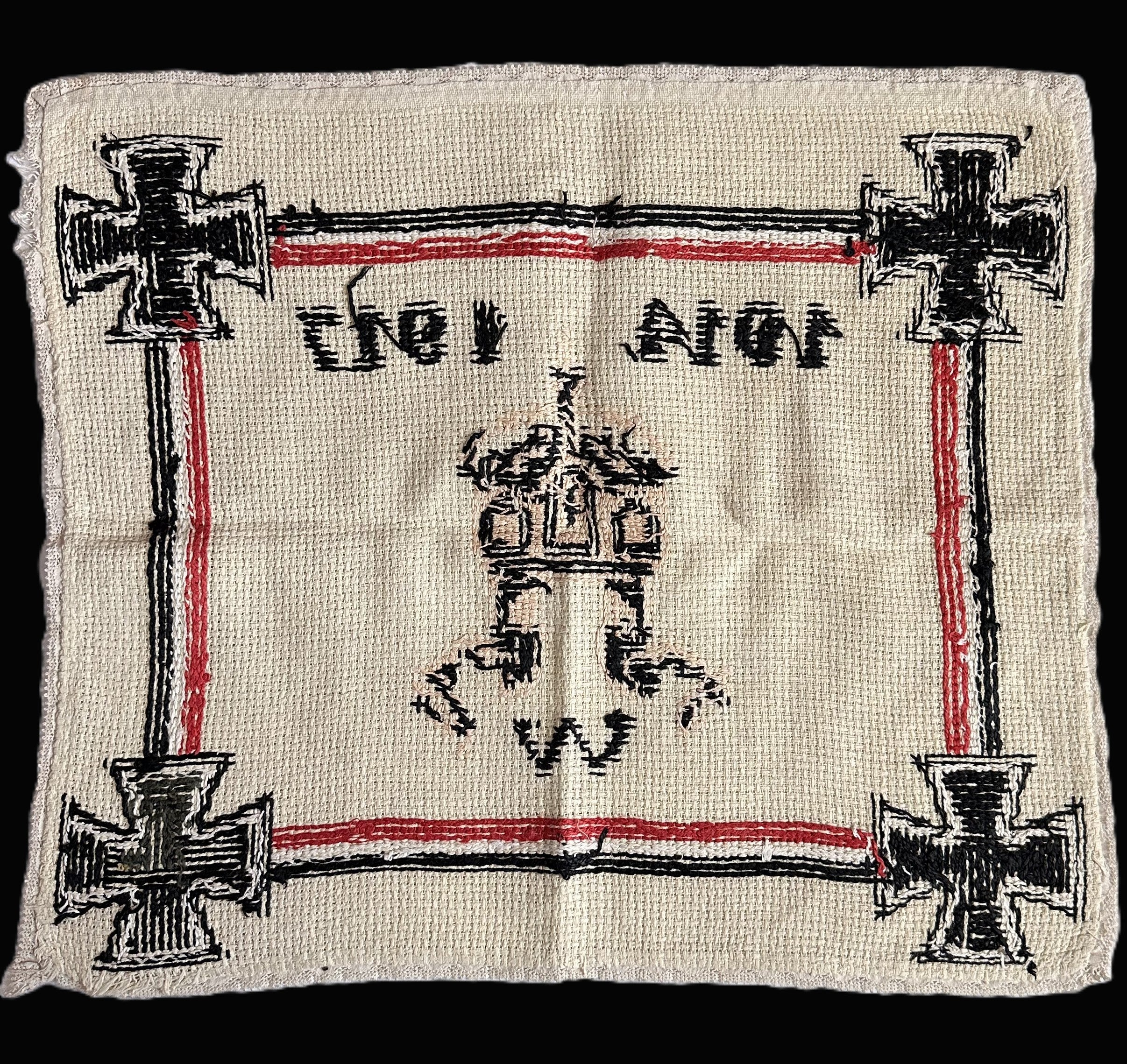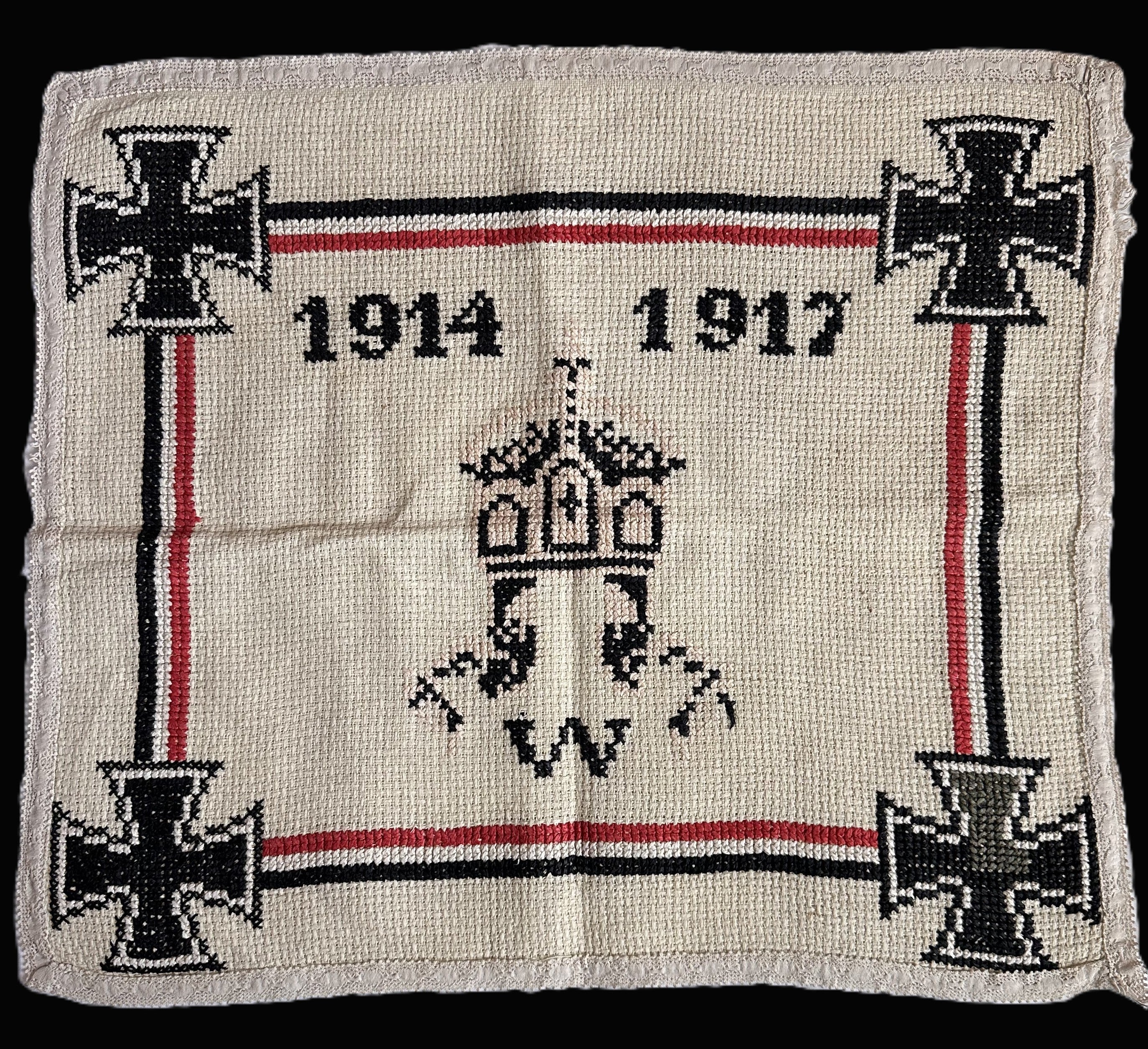 This finely hand-embroidered wartime textile commemorates Germany’s involvement in the First World War, dating from 1914–1917. Worked on a cream woven ground in black, red, and white thread, the design features four Iron Crosses—one in each corner—framing the dates 1914 and 1917, and the crowned imperial cypher “W” for Kaiser Wilhelm II at center.