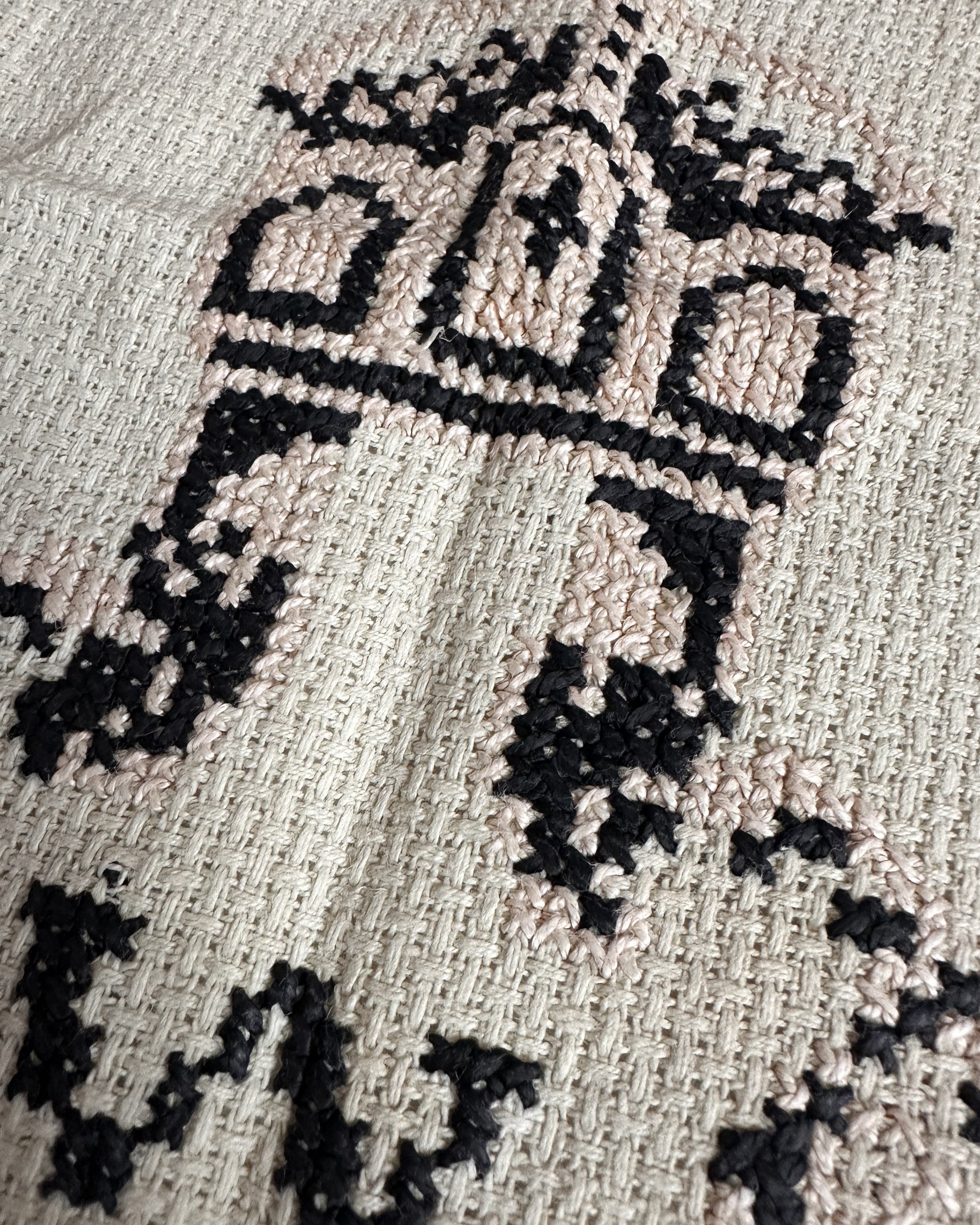 The reverse shows the neat cross-stitch pattern of the embroidery, confirming it as hand-made rather than machine-worked.