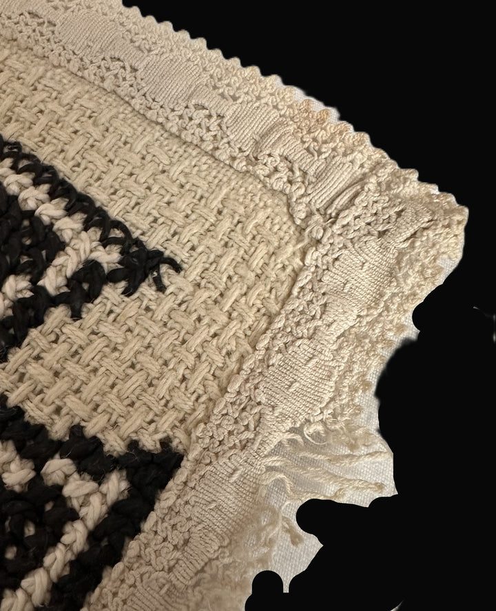 Condition: Very Good. The textile remains complete and stable, with mild age toning and light edge fray consistent with its age. Colors are well preserved, and the lace border remains largely intact. No tears or staining noted.