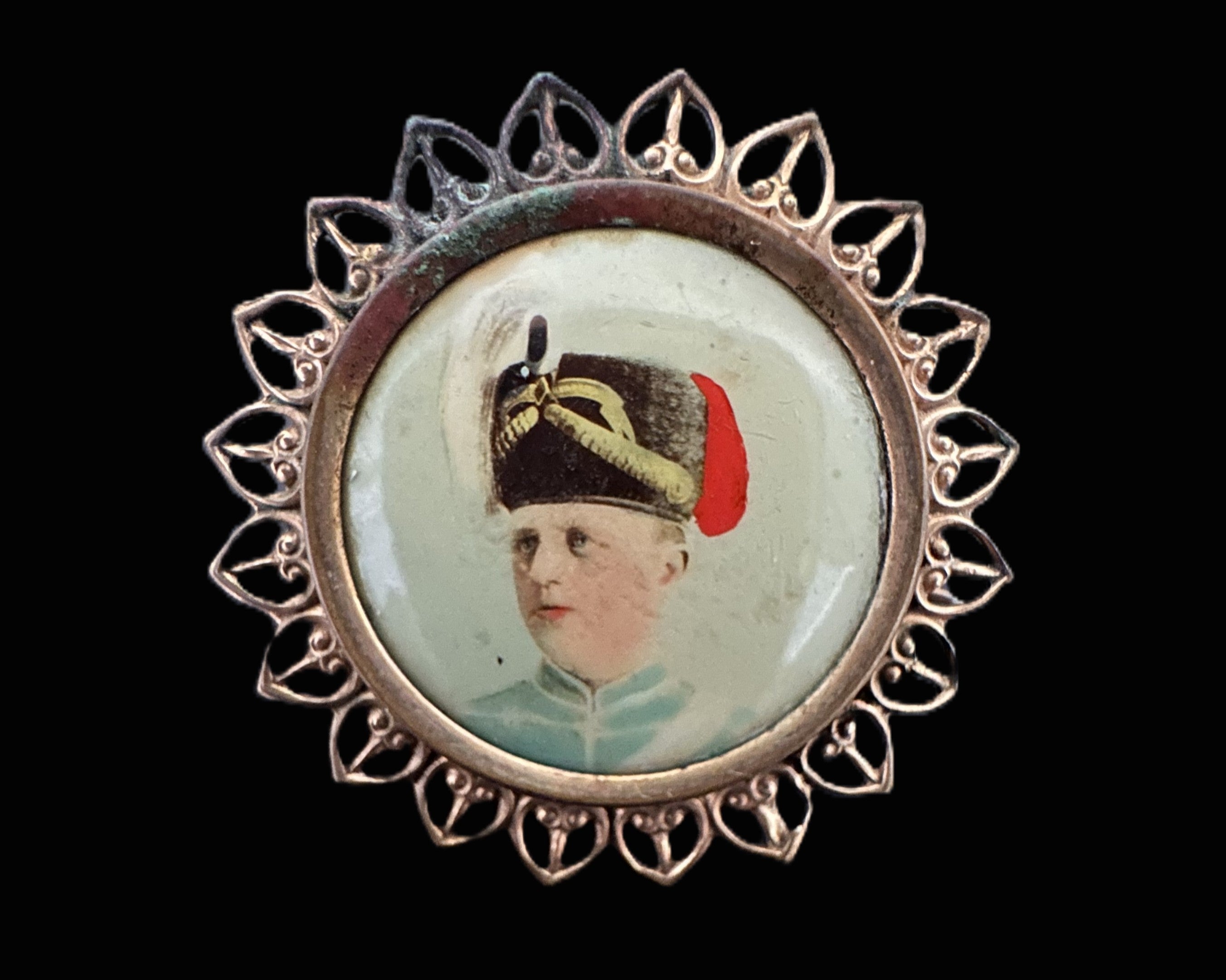 Hussar uniforms were iconic among European militaries, particularly in the late 19th century, often symbolizing elegance and valor. Portrait pins like this one were popular among soldiers’ families and sweethearts as mementos during periods of service or wartime.