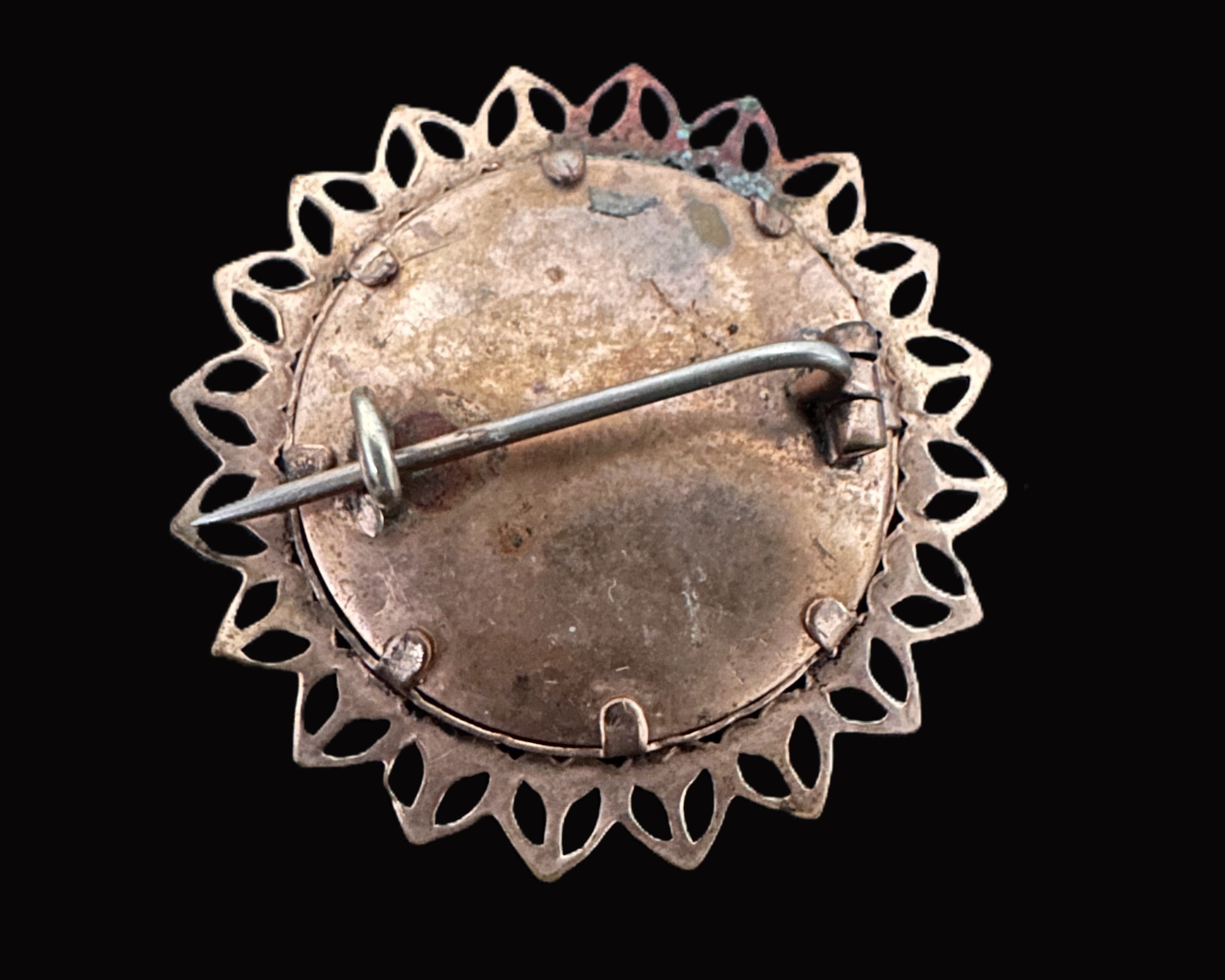 The reverse side shows its original C-clasp pinback, which remains functional, though there is moderate tarnishing consistent with age. A faint green oxidation is present on the filigree, adding to the piece’s antique character. The piece is unmarked but demonstrates the craftsmanship of mid-tier German artisan workshops that catered to commemorative and patriotic tastes.