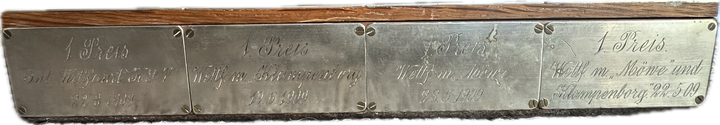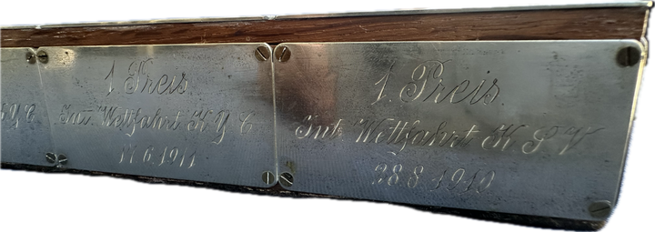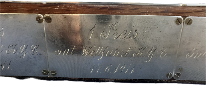 - Engraving Details: The inscriptions on the plaques mention the type of race and the specific dates, such as "Smt. Wettfahrt K.Y.C." (Sailing Race, Kaiserlicher Yacht Club), a reference to various types of sailing competitions, most likely part of the prestigious regattas held by the KYC. The engraved dates, such as 17.6.1911, 31.8.1912, and 19.6.1909, represent the specific dates on which these regattas took place.
