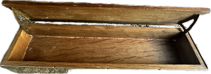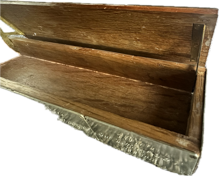 The box is in excellent condition for its age. The wood shows minor wear, but the interior remains well-preserved, and the plaques still maintain their luster. The inscriptions are clearly legible, adding to its display value. The interior compartment is clean, making the piece both functional and highly collectible.