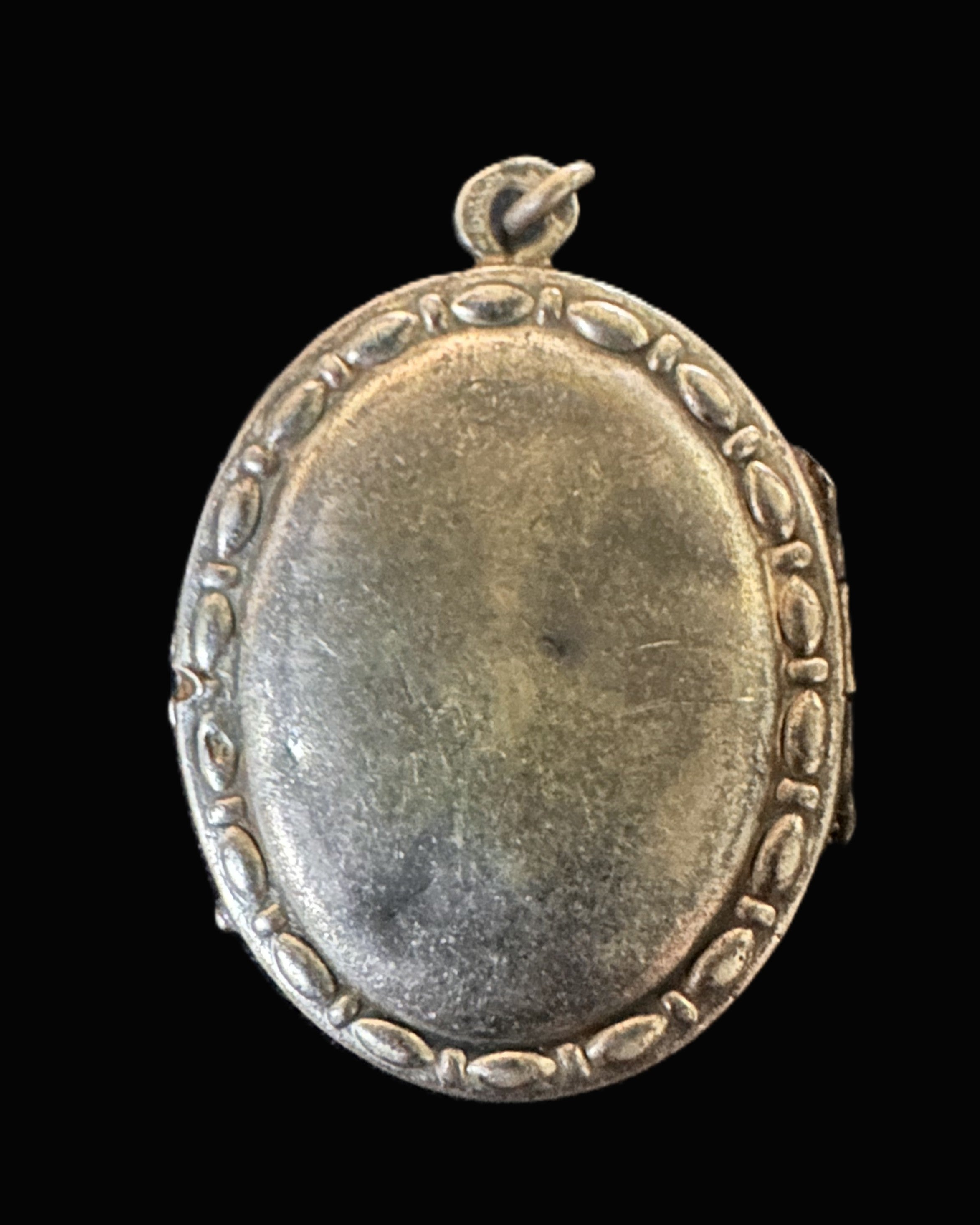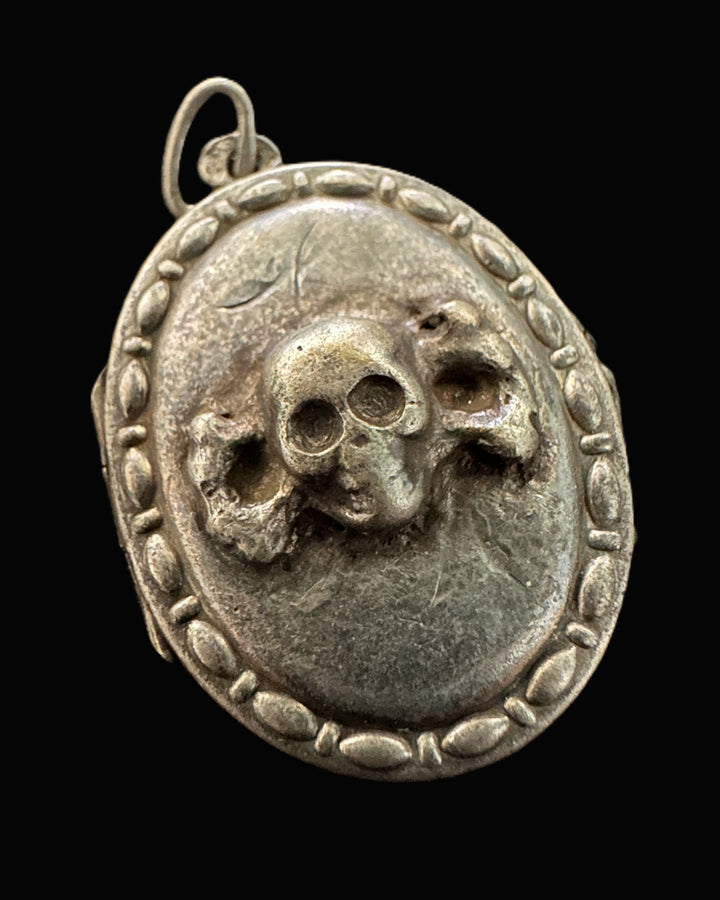 The oval locket, approximately 1.25 x 1 inch, features a finely modeled skull relief framed by an oval border of laurel-like links. The hinge opens cleanly to reveal twin interior compartments, likely once housing portraits or a lock of hair. The interior shows a faint central aperture and gentle age patina throughout, with untouched surfaces inside and out.