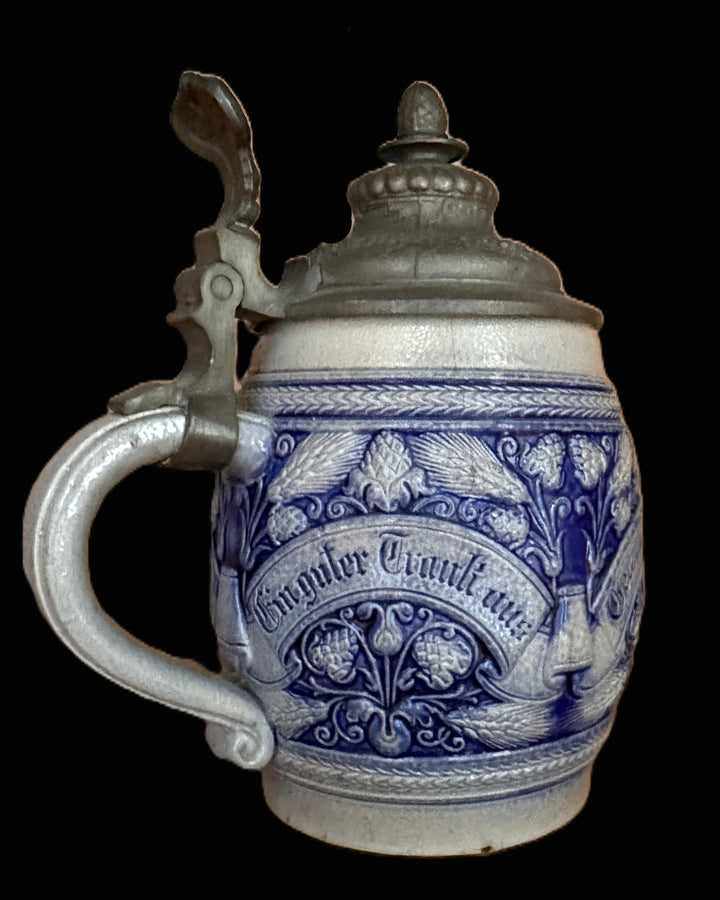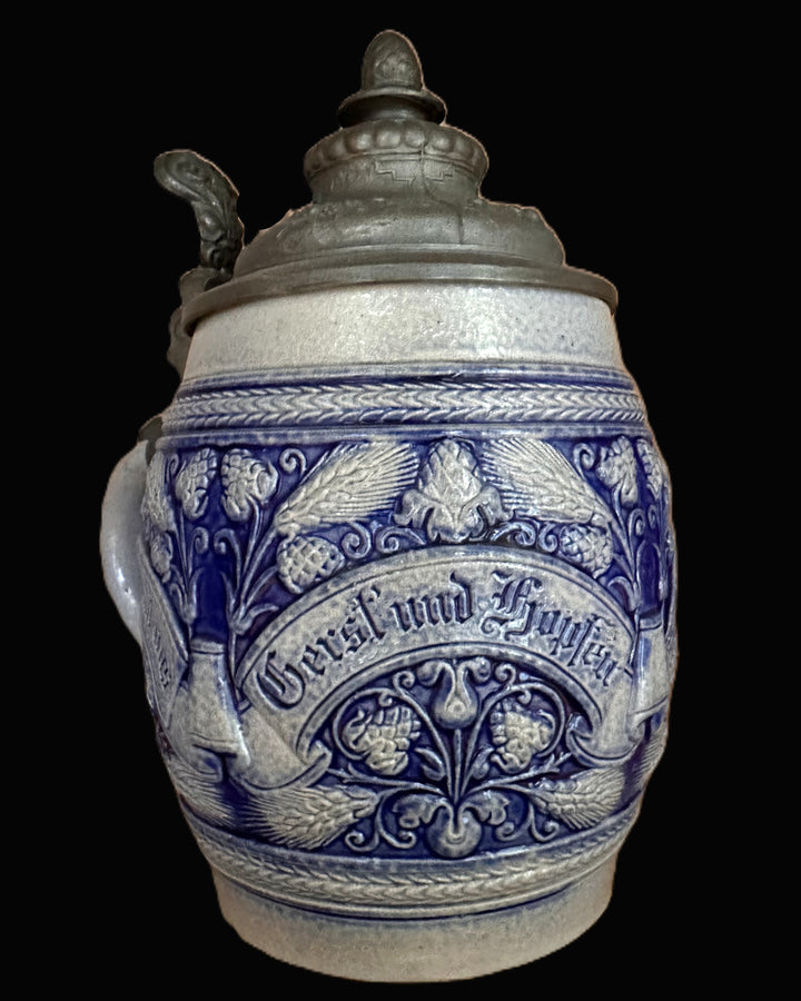 This richly decorated German stoneware beer stein dates to the late 19th or early 20th century and features a striking blue and grey salt-glazed finish with a classic pewter lid. The front and sides are adorned with deeply embossed designs of hop vines and barley stalks—symbolic nods to the stein’s theme: “Gerste und Hopfen” (Barley and Hops).