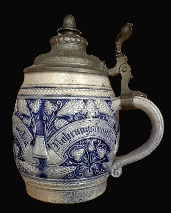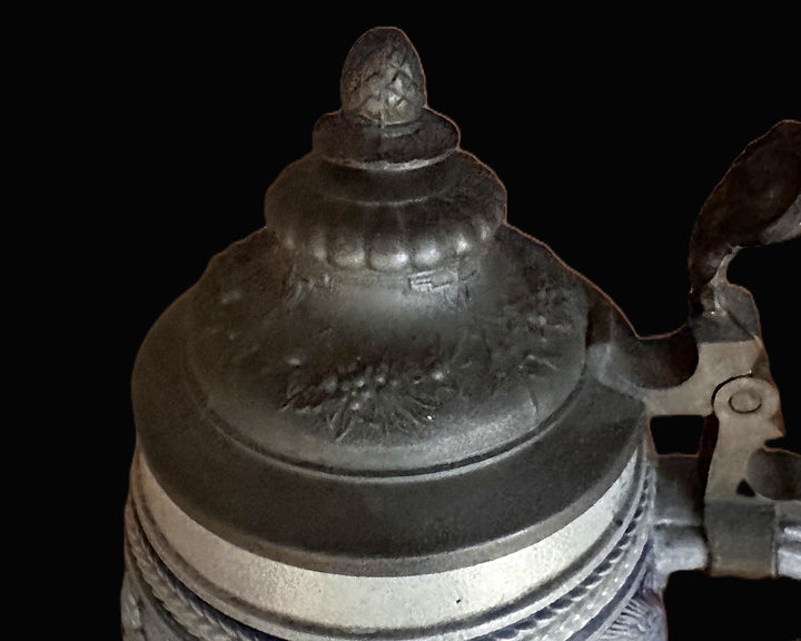 German Stoneware Beer Stein with Pewter Lid – “Gerste und Hopfen” Relief, Mold Number 486
