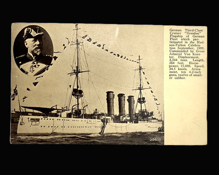 Keywords: Hudson-Fulton Celebration, SMS Dresden, Gross Admiral Von Koester, German Navy postcard, naval history collectible, Imperial German Navy, 1909 naval review, historical postcard, military memorabilia, pre-WWI naval engineering.
