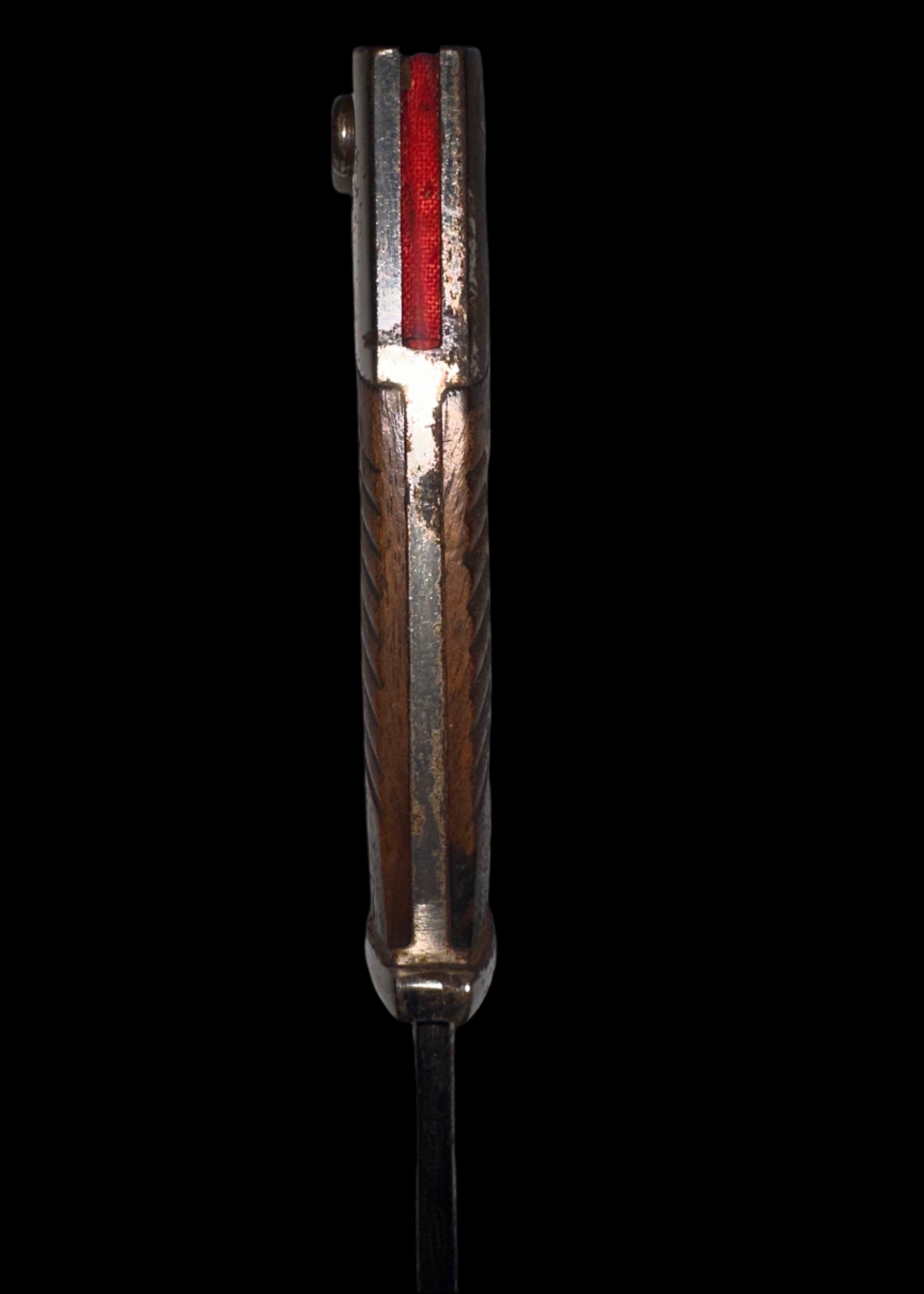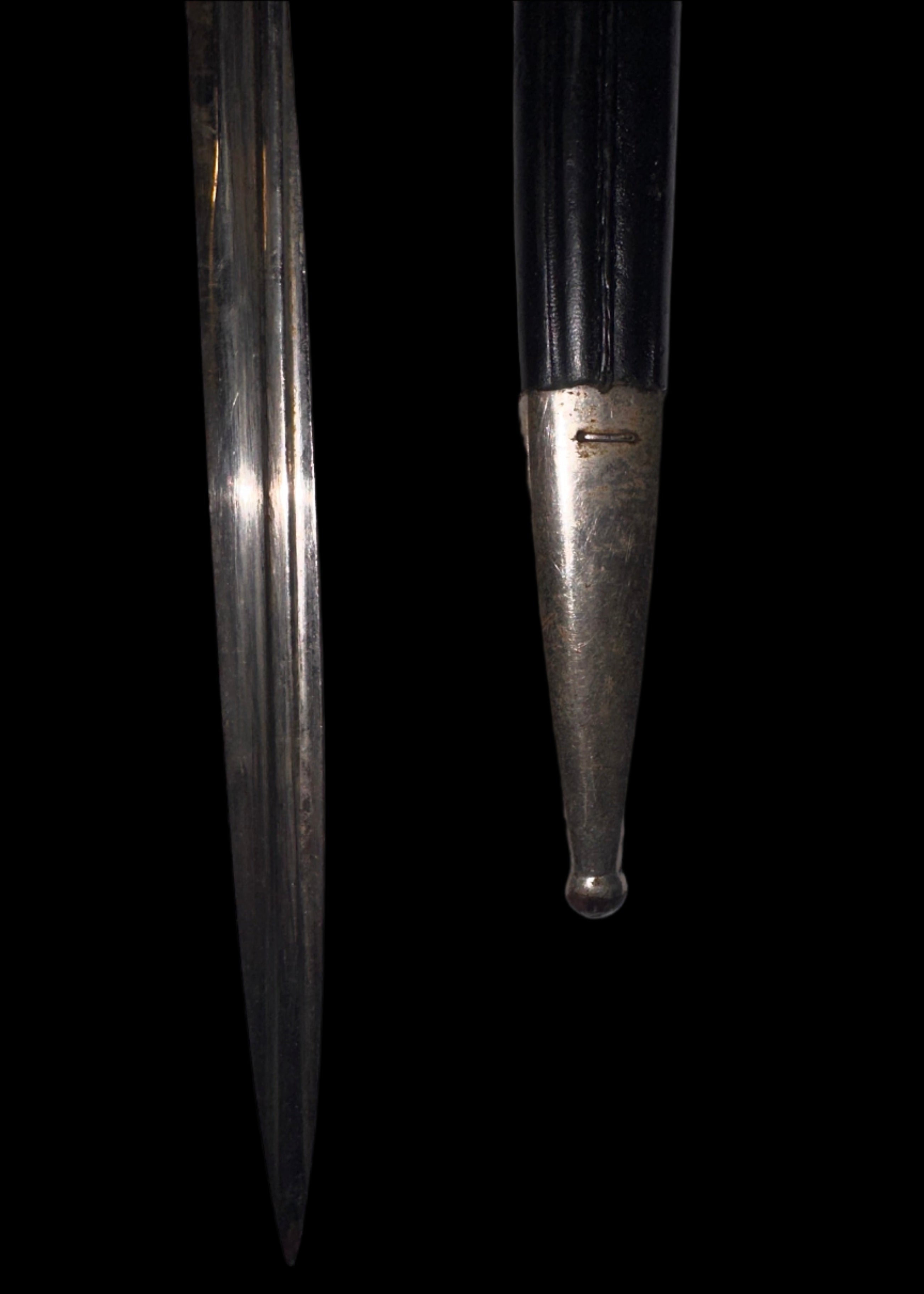 One side of the bayonet spine bears remnants of a red felt insert in the mortise slot, often an indication of German imperial issue and sometimes associated with guard units or parade-dress configuration, though this detail is no longer definitive without regimental markings.