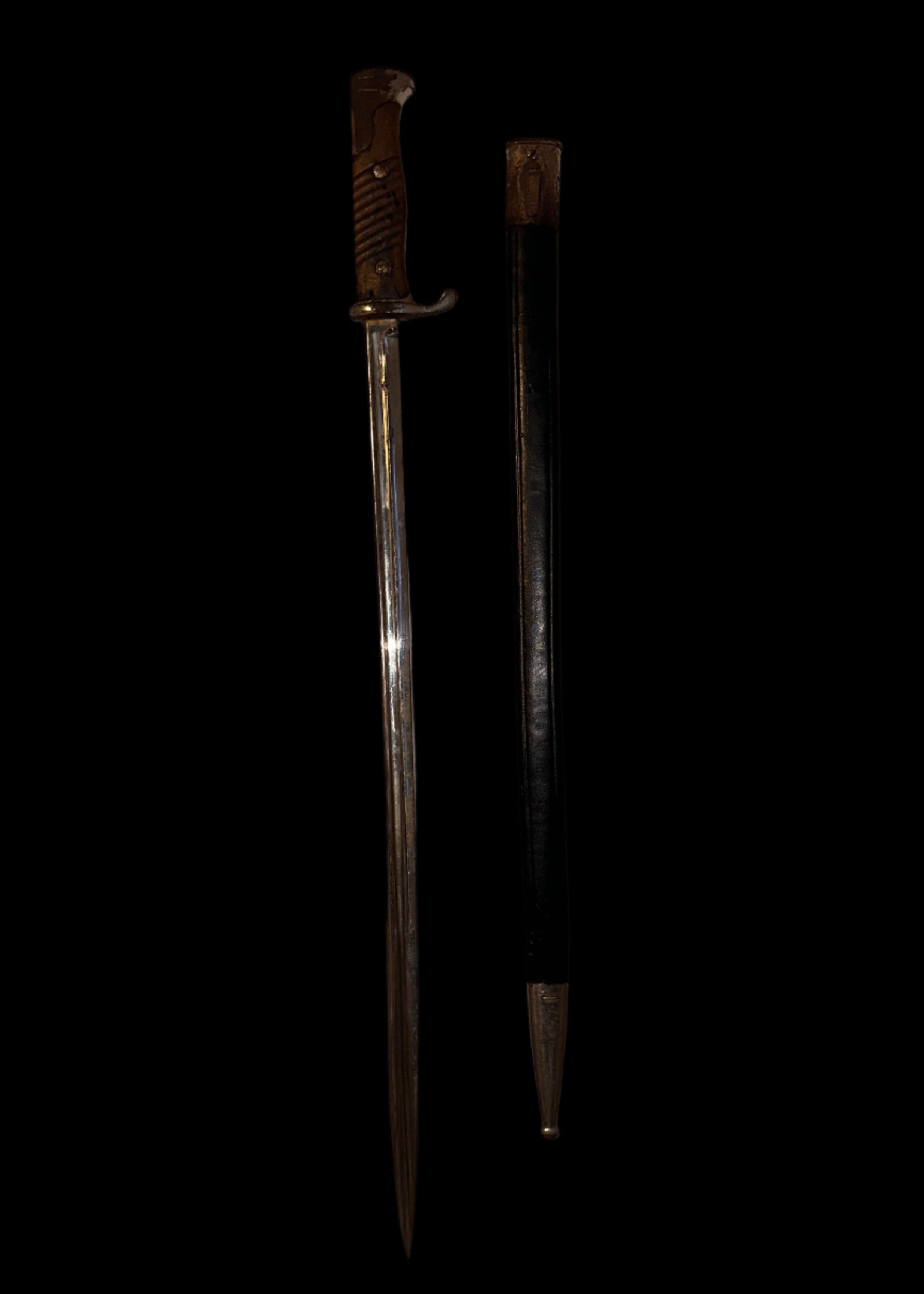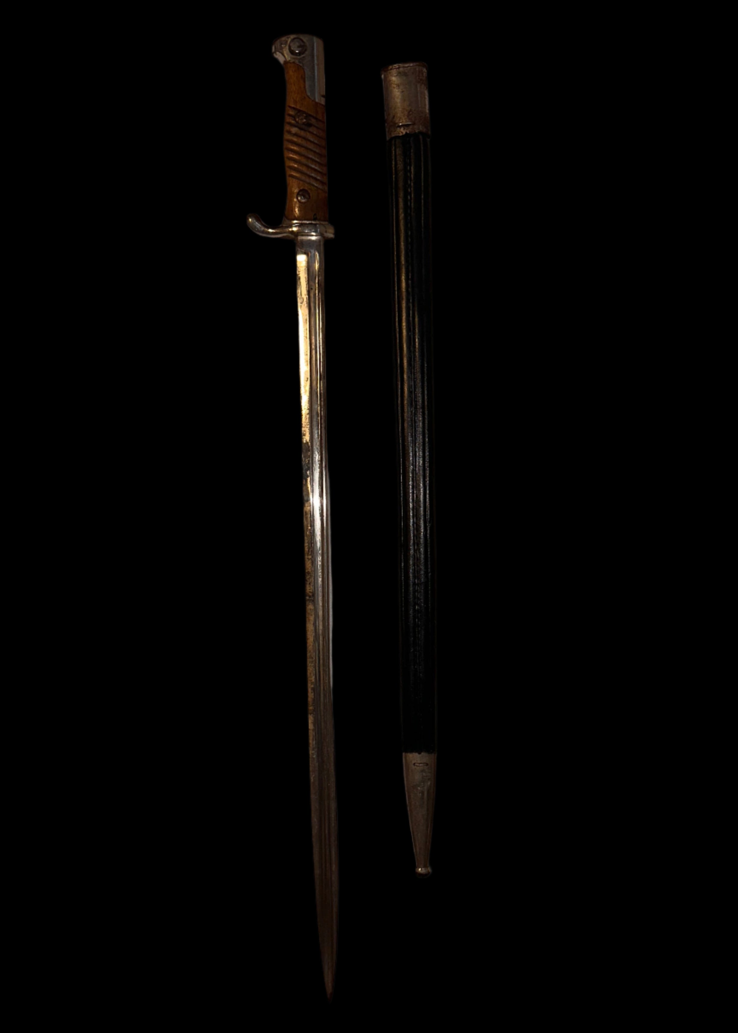 This is a fine example of the German Seitengewehr 1898 (S98) bayonet, widely issued during the First World War for use with the Gewehr 98 Mauser rifle. These bayonets are known for their long, slim profile and elegant lines — a design originally conceived when the German military prioritized thrusting capability over chopping power in its edged weapons.