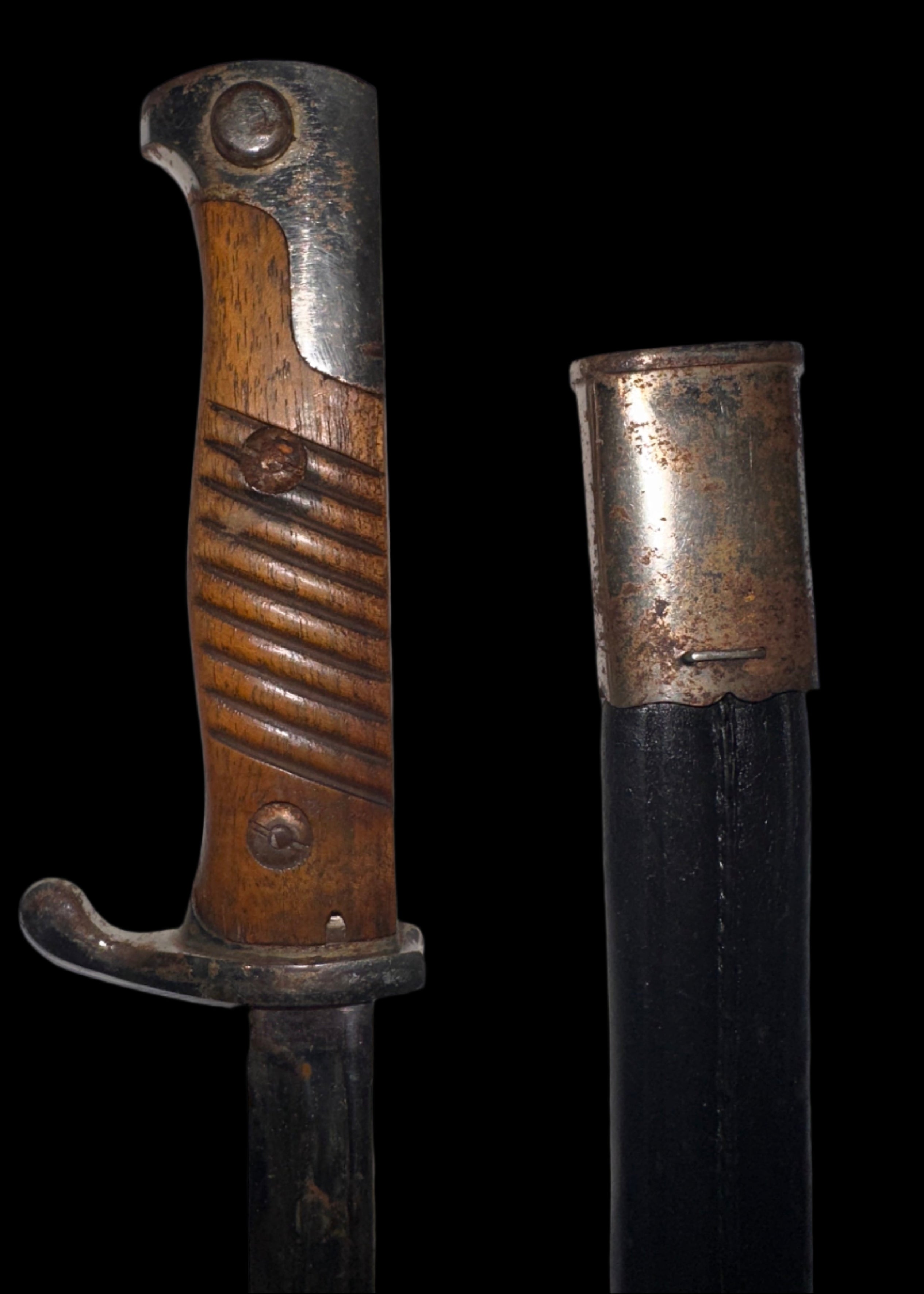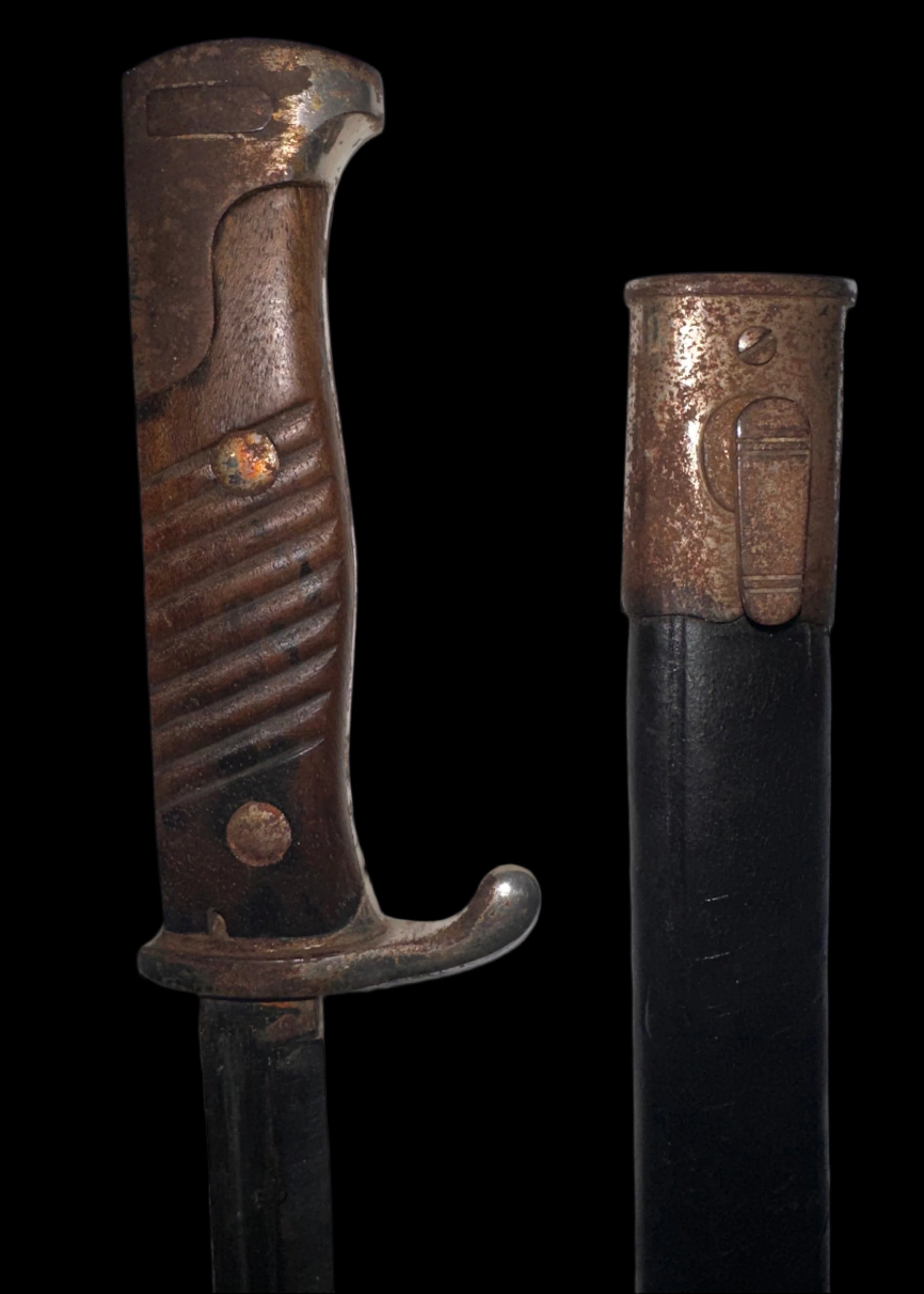 Good field-used condition overall. The blade is structurally intact with moderate patina and surface pitting. The hilt shows oxidation and finish loss consistent with combat use. Grips are tight with no major cracks. The scabbard is complete and holds the bayonet securely, though finish wear is evident.