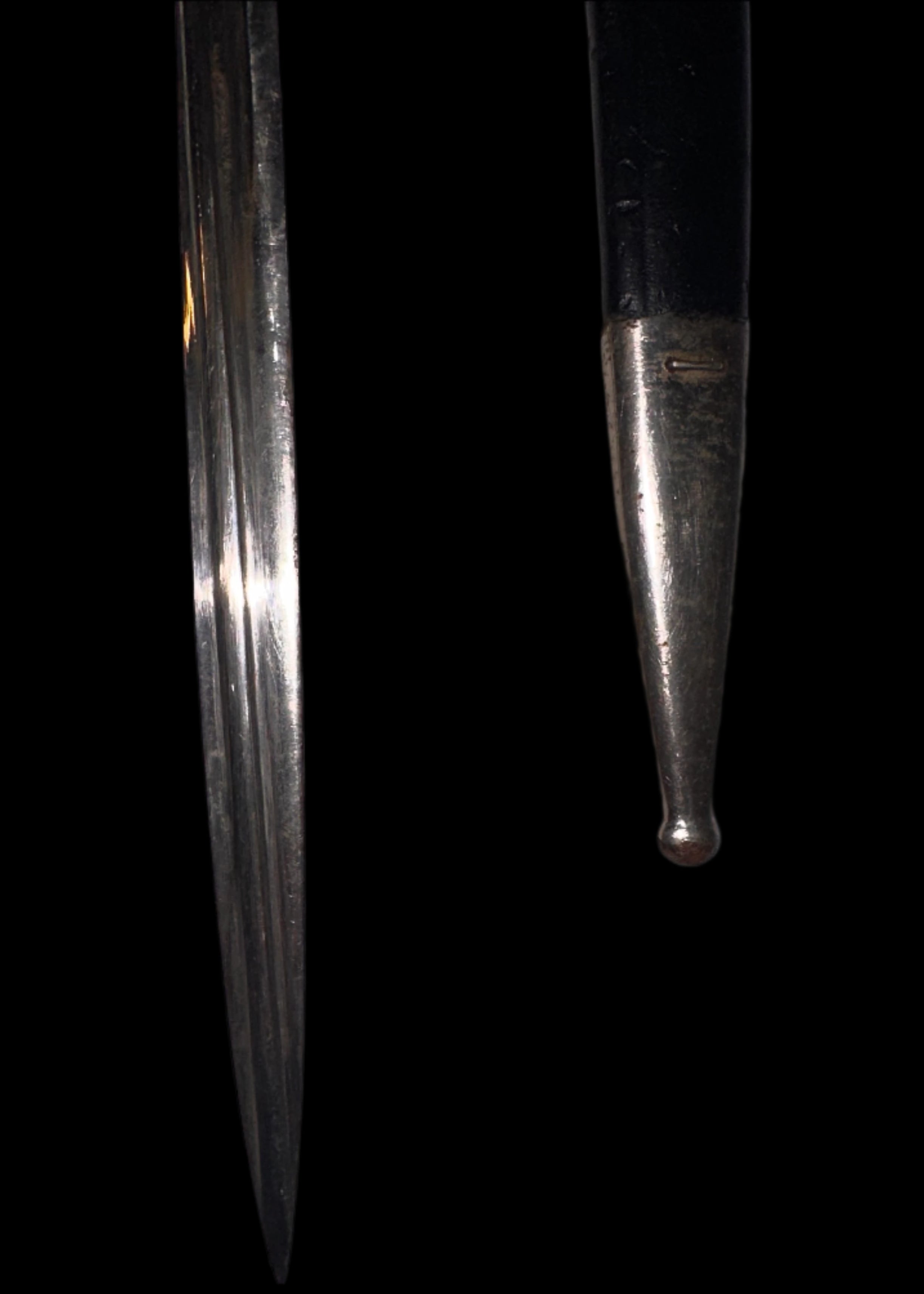 The blade remains full-length and straight, with a full-length single fuller and visible edge wear from age and use. The blade retains a portion of its original bright finish, though spots of darkening and pitting are present near the ricasso and tip — consistent with field use and storage over a century.