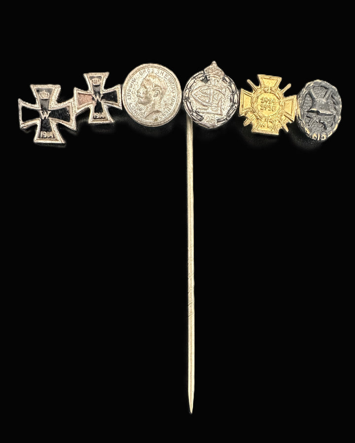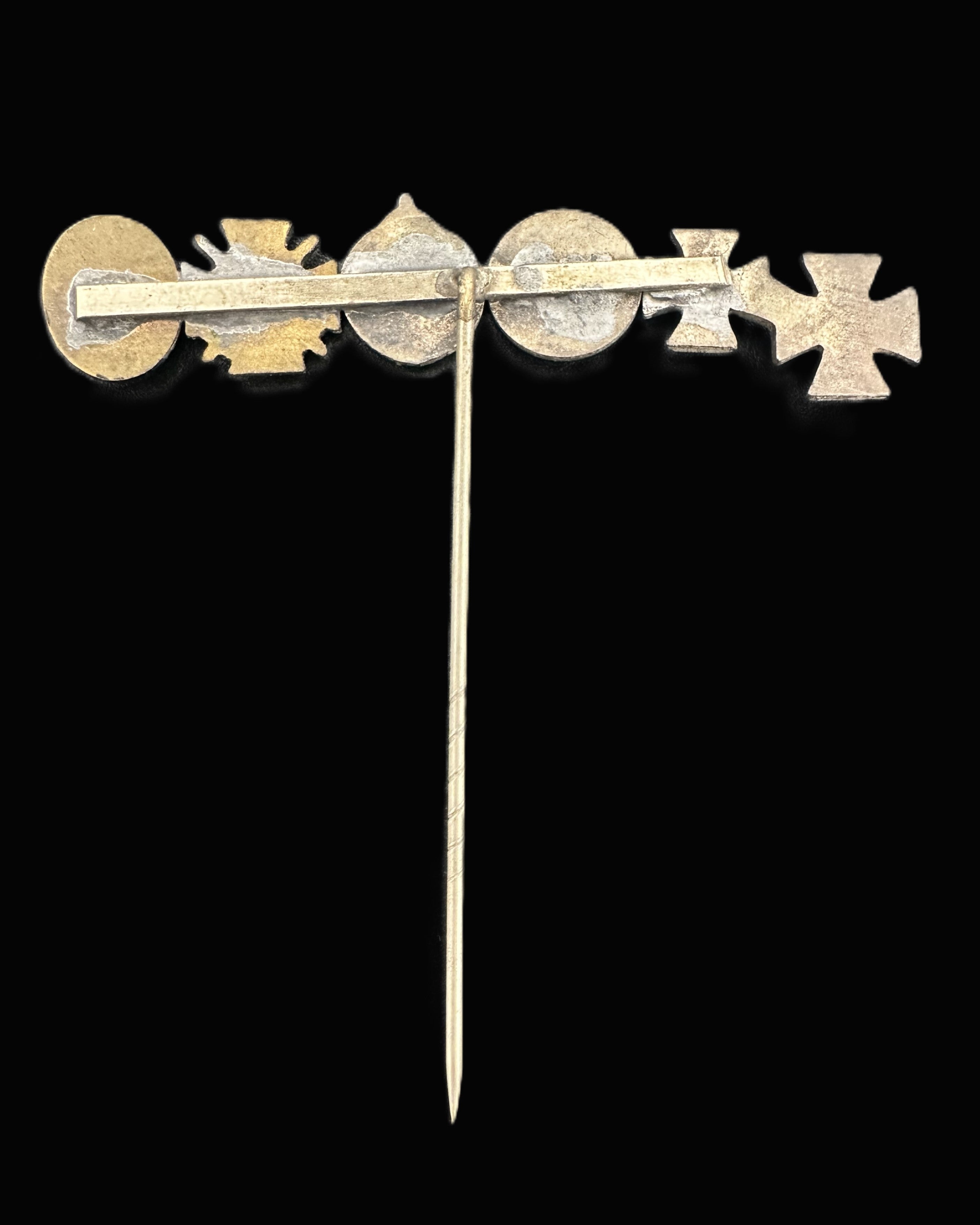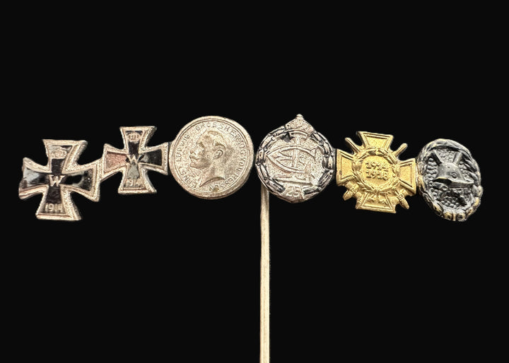 This is a fine example of a German World War I veterans' stickpin, featuring six meticulously crafted miniature medals. These small-scale representations are often highly prized by collectors for their historical significance and craftsmanship, as they were worn to signify service, awards, and affiliations in post-war veterans' events or gatherings.