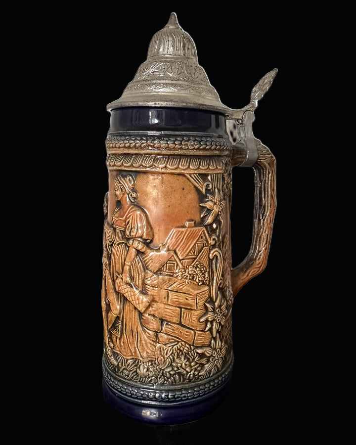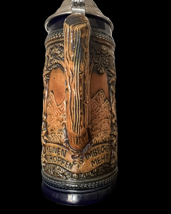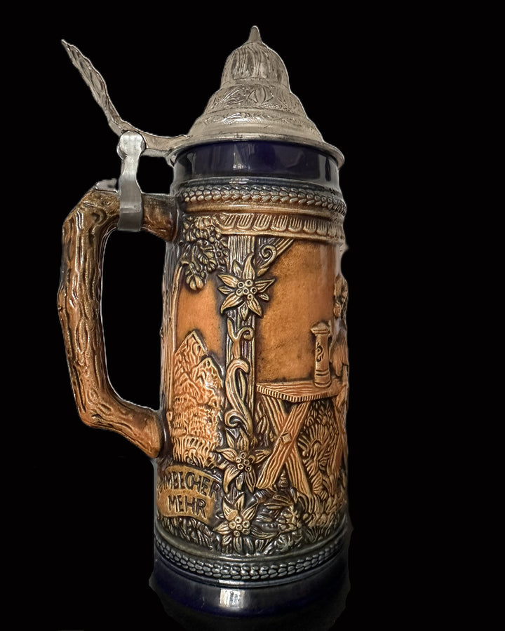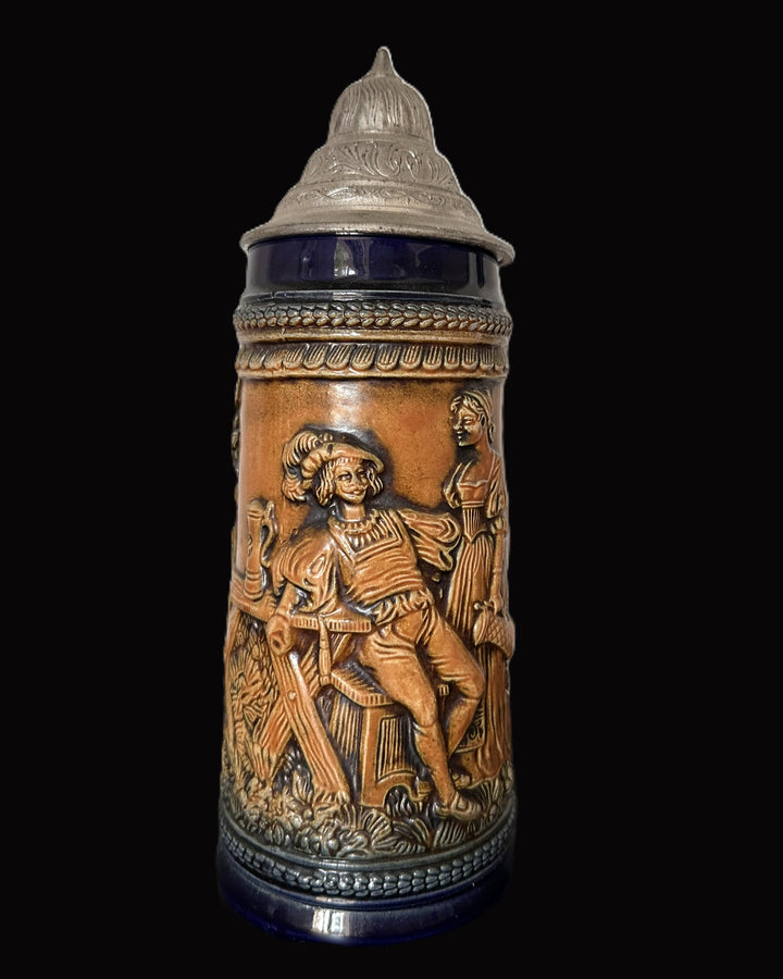 Gerz beer stein embodies the exceptional artistry and tradition of German stein-making. Made in West Germany during the mid-20th century, it features a striking high-relief design with a vibrant blue glaze and earthy tones.