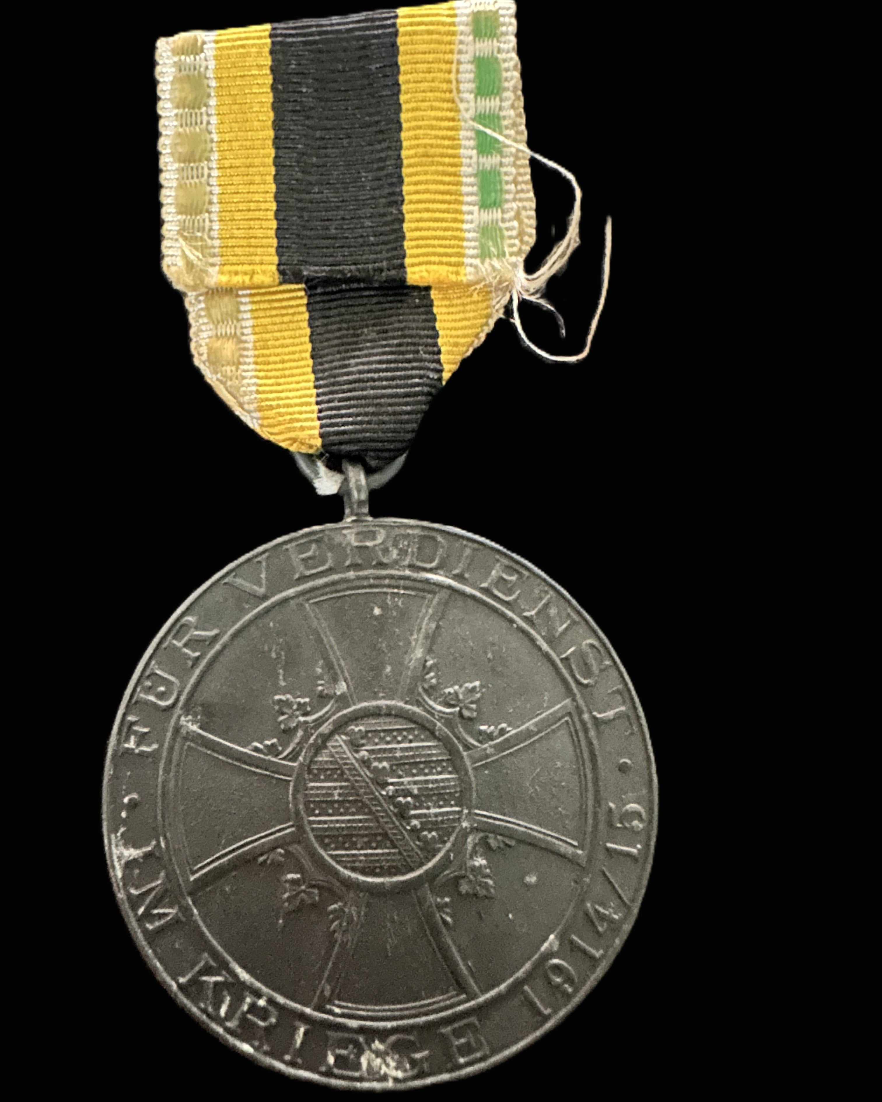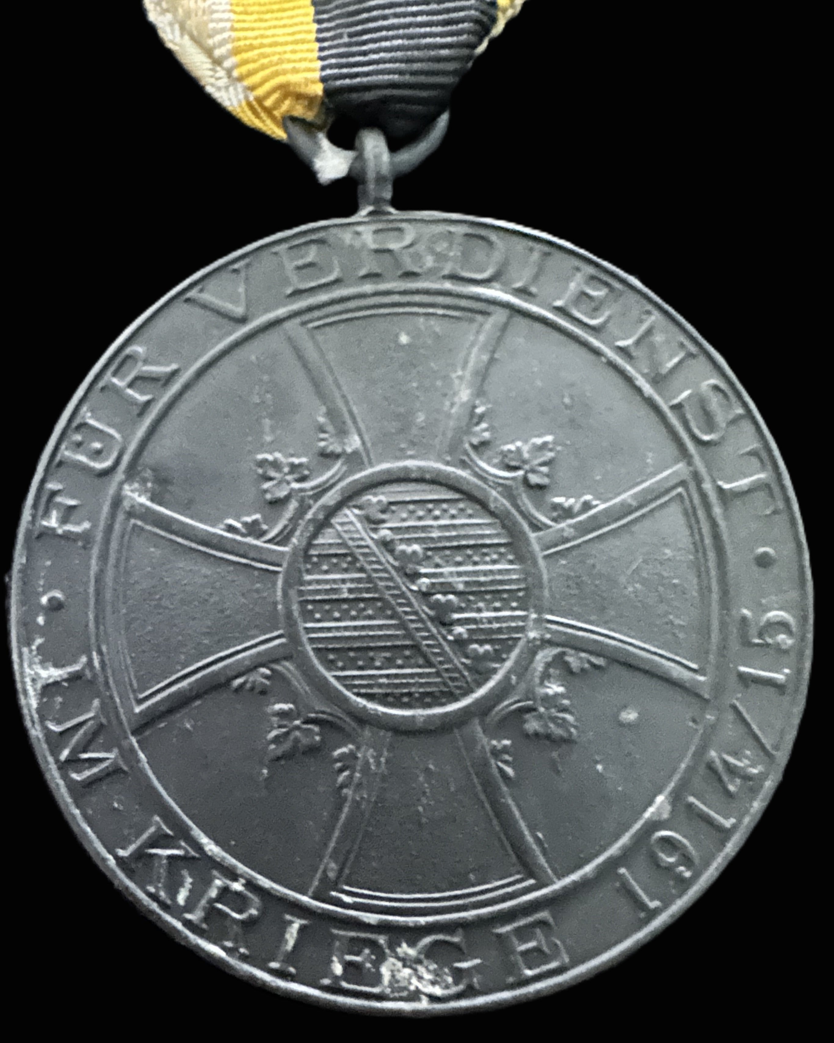 Reverse: Features the Saxe-Weimar-Eisenach arms at the center of a cross pattée, encircled by the raised inscription FÜR VERDIENST IM KRIEGE 1914/15 (“For Merit in War 1914/15”).