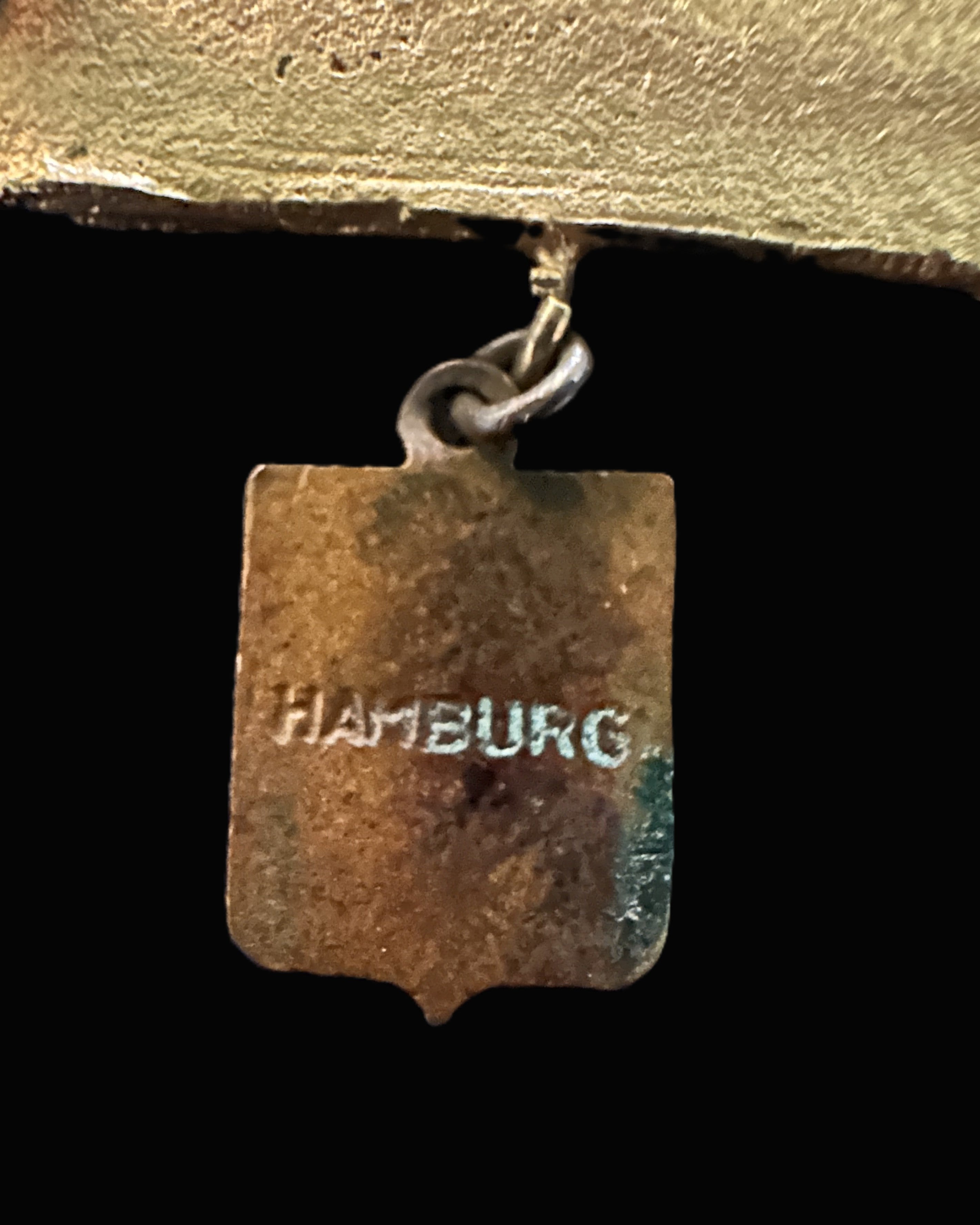Hamburg’s distinctive arms—fortified walls and gate crowned by three towers—symbolized the city’s medieval autonomy as a Hanseatic stronghold and its enduring self-governance within the German Empire after 1871. The oak branch, a deeply rooted emblem in German tradition, conveyed fidelity, civic virtue, and national pride. Brooches of this form were popular tokens of local identity, often purchased as parade jewelry or keepsakes from veterans’ associations, harbor festivals, and choral societies. Their mixture of heraldic precision and personal symbolism made them cherished expressions of Heimat sentiment in a rapidly modernizing age.