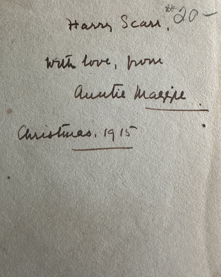 This inscription predates the official publication year, strongly suggesting the book was acquired or gifted at the very end of 1915 or during the earliest 1916 release window—entirely consistent with wartime publishing practices and holiday gifting. The inscription provides direct personal provenance to an original wartime civilian or family context, enhancing collector appeal.