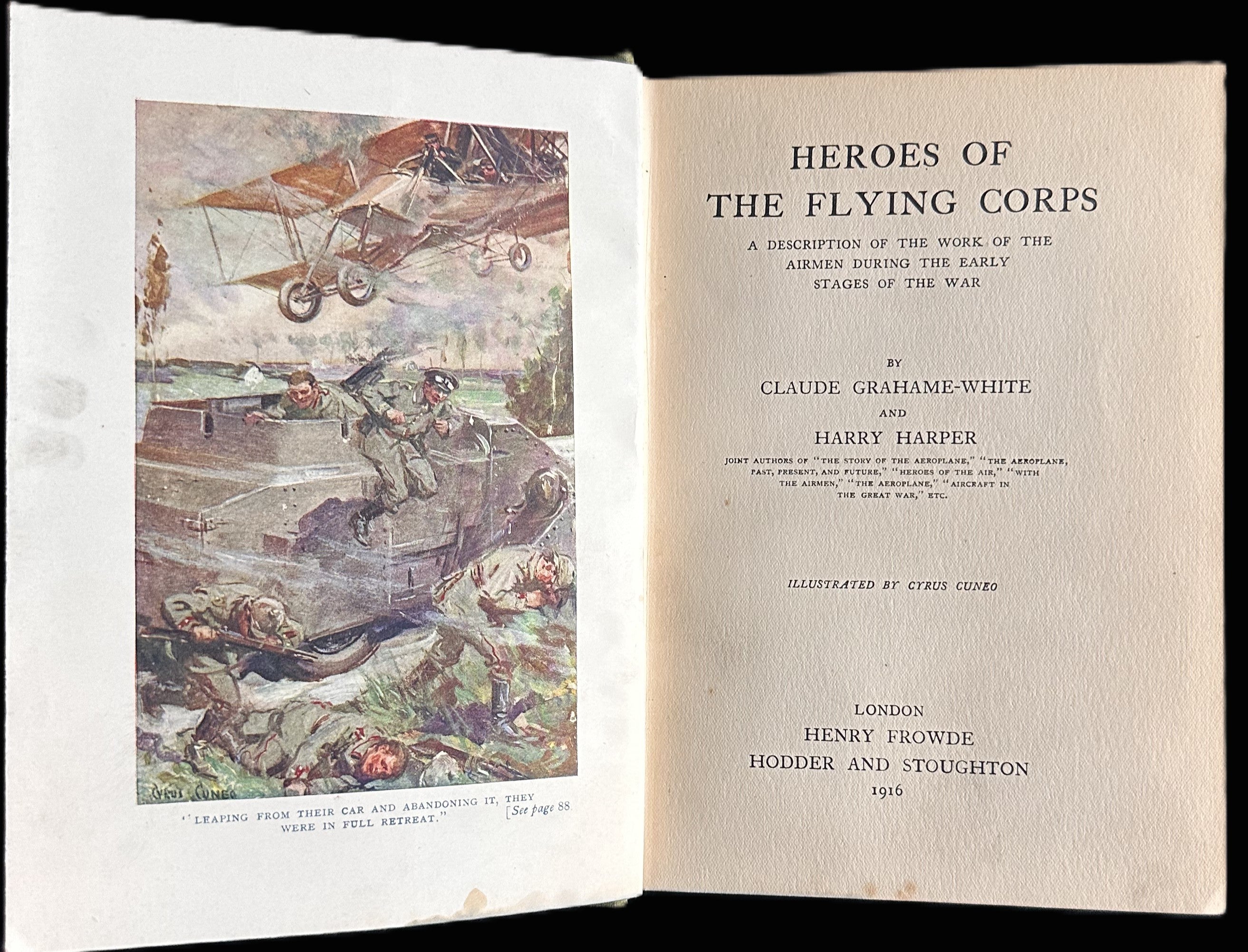 Original World War I aviation history volume titled Heroes of the Flying Corps: A Description of the Work of the Airmen During the Early Stages of the War, published in London in 1916 by Henry Frowde / Hodder & Stoughton. Authored by Claude Grahame-White—one of Britain’s pioneering aviators—and Harry Harper, this work stands as an early and influential contemporary account of military aviation at the outbreak of the Great War. The book is illustrated throughout, including full-color plates by noted aviation and war artist Cyrus Cuneo, depicting aerial combat, reconnaissance, and airship engagements during the formative years of air warfare.