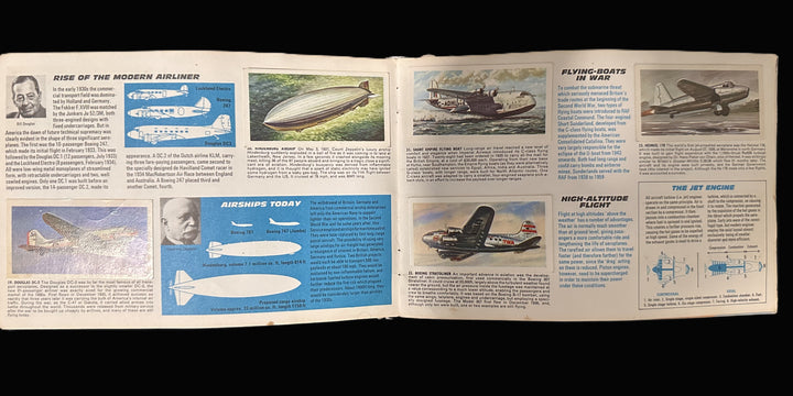 The booklet features vibrant full-color illustrations and concise historical summaries of each aircraft, including the Douglas DC-3, Heinkel 178, Boeing Stratoliner, and the V-bombers of Cold War Britain. Educational and richly illustrated, it provides a snapshot of aviation development across the 20th century.