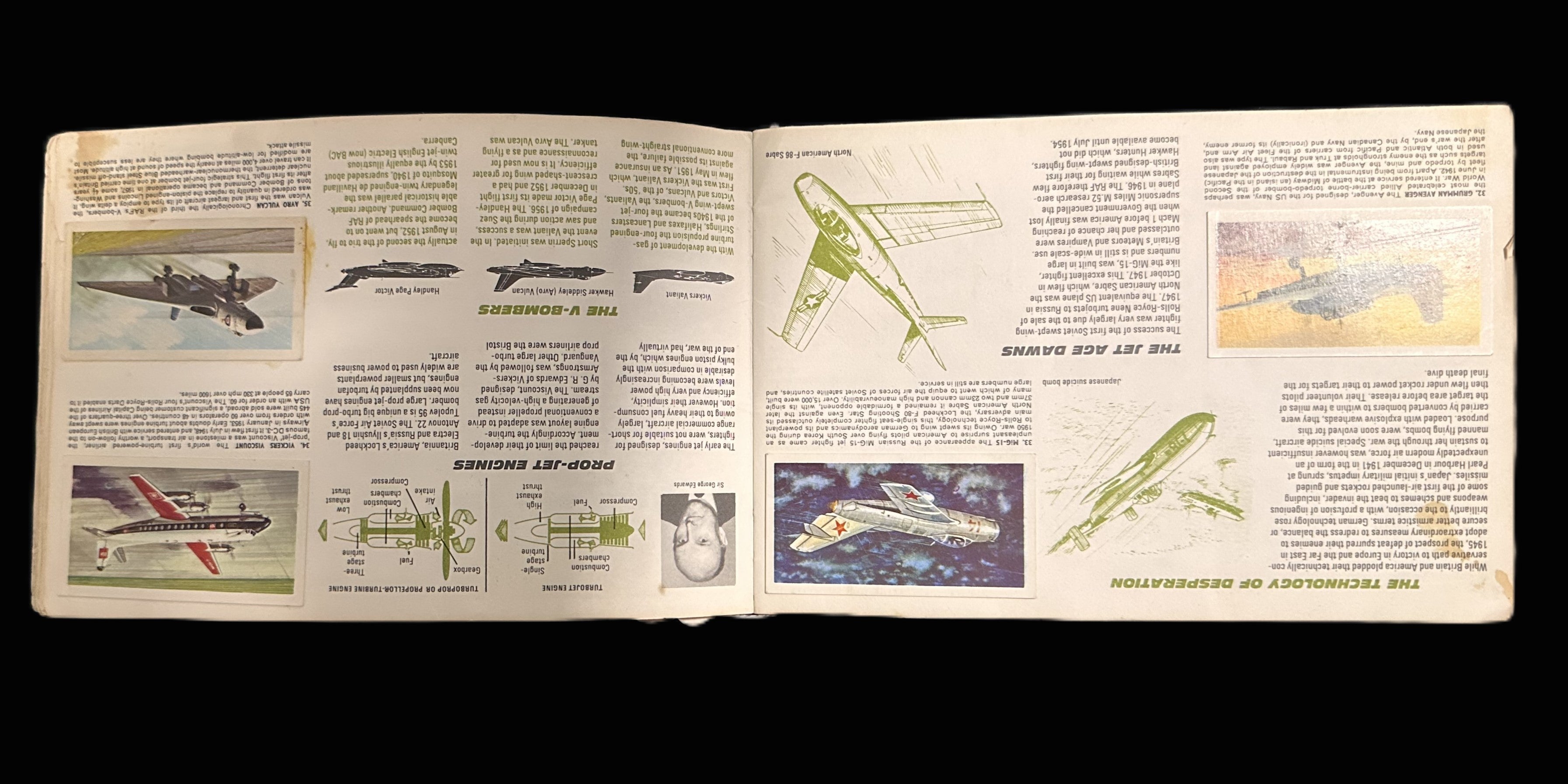 This vintage softcover booklet, published by Brooke Bond Oxo in the interest of education, was originally distributed with Brooke Bond Tea and Tea Bags as a collectible series. Titled History of Aviation, it includes a full set of 50 picture cards chronicling some of the most iconic aircraft in the history of aviation, from early biplanes and zeppelins to post-war jet bombers and commercial airliners.