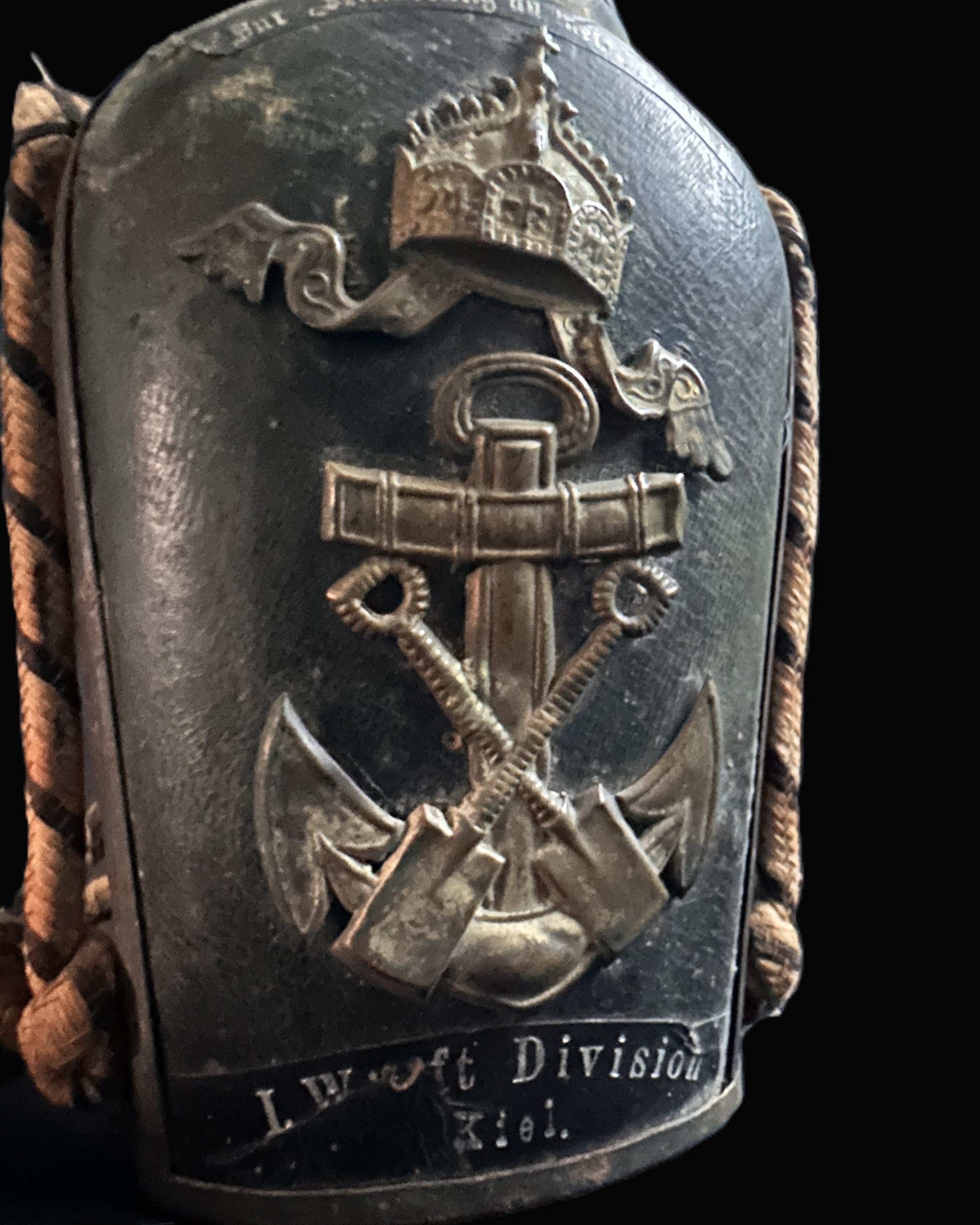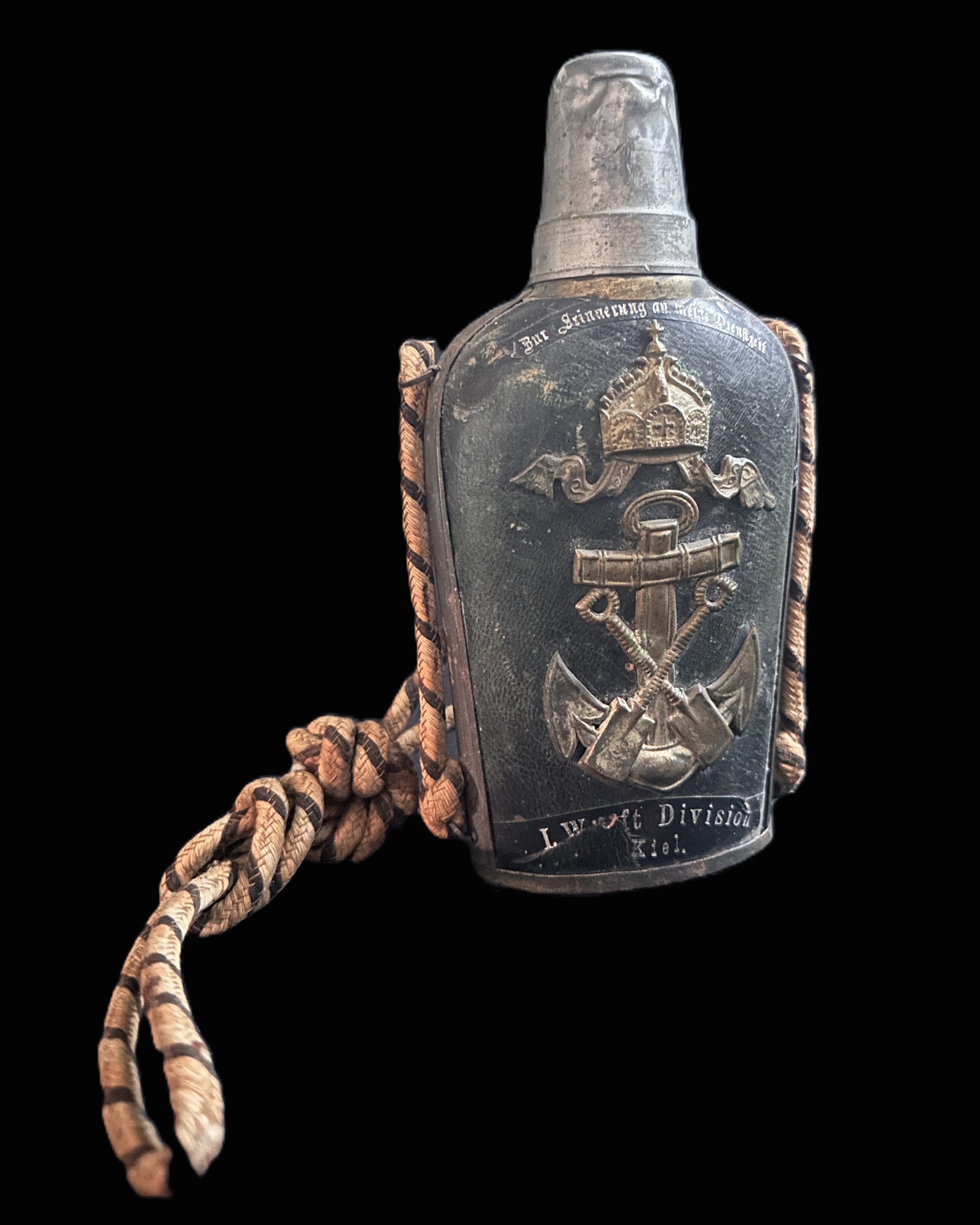 The Werft-Divisionen (Dockyard Divisions) were based at Germany’s major naval ports (Kiel, Wilhelmshaven, and Danzig). Unlike front-line fleet units, they were responsible for dockyard labor, maintenance, and manning coastal fortifications, yet their sailors still endured the strict discipline and national service obligations of their sea-going comrades. Kiel, the home of the 1. Werft Division, became especially significant in 1918 as the center of the famous Kiel Mutiny, which triggered the German Revolution and the end of the monarchy. Souvenirs like this flask would have been purchased years earlier, during an era of Imperial pride and naval buildup under Kaiser Wilhelm II.