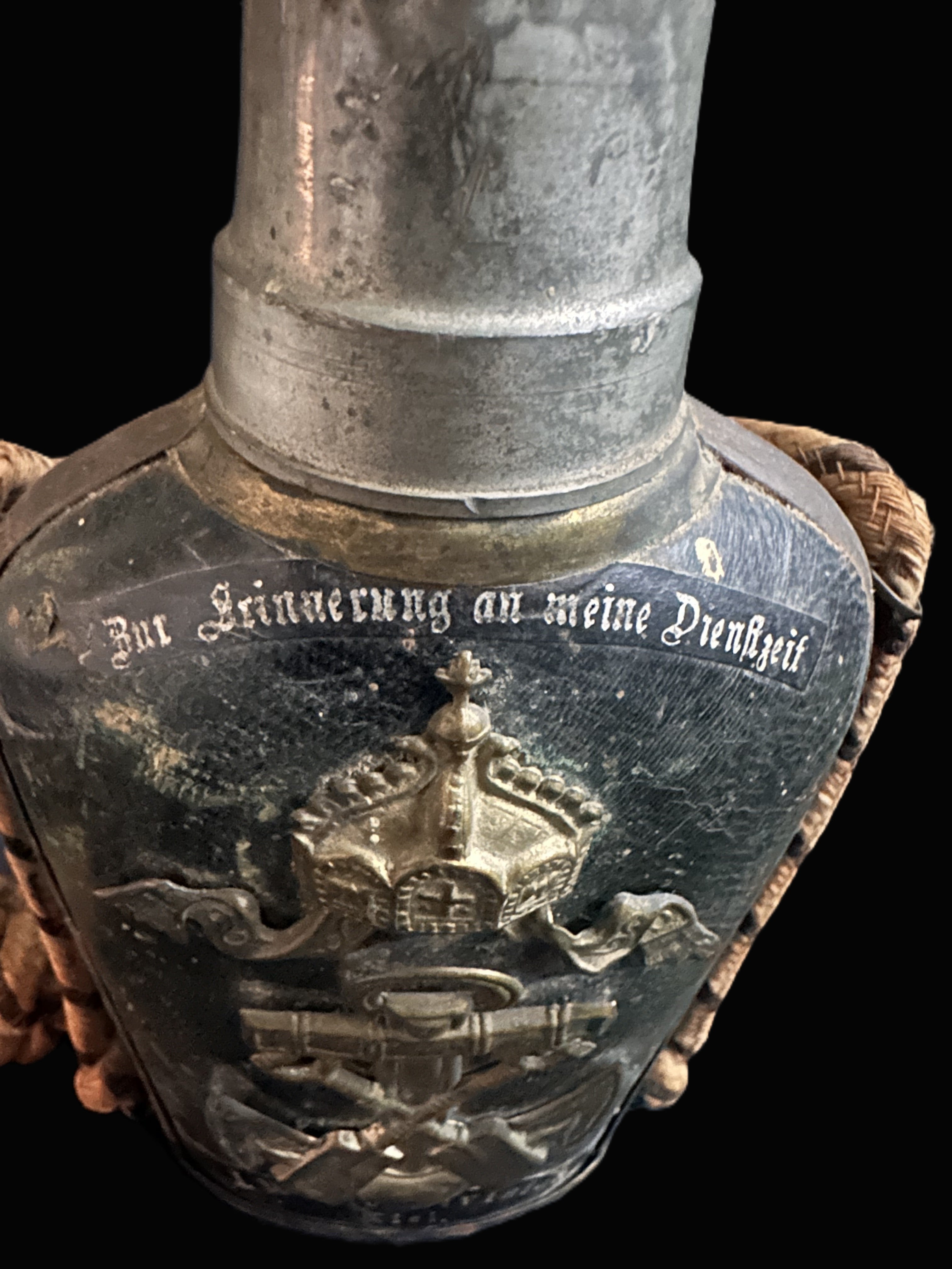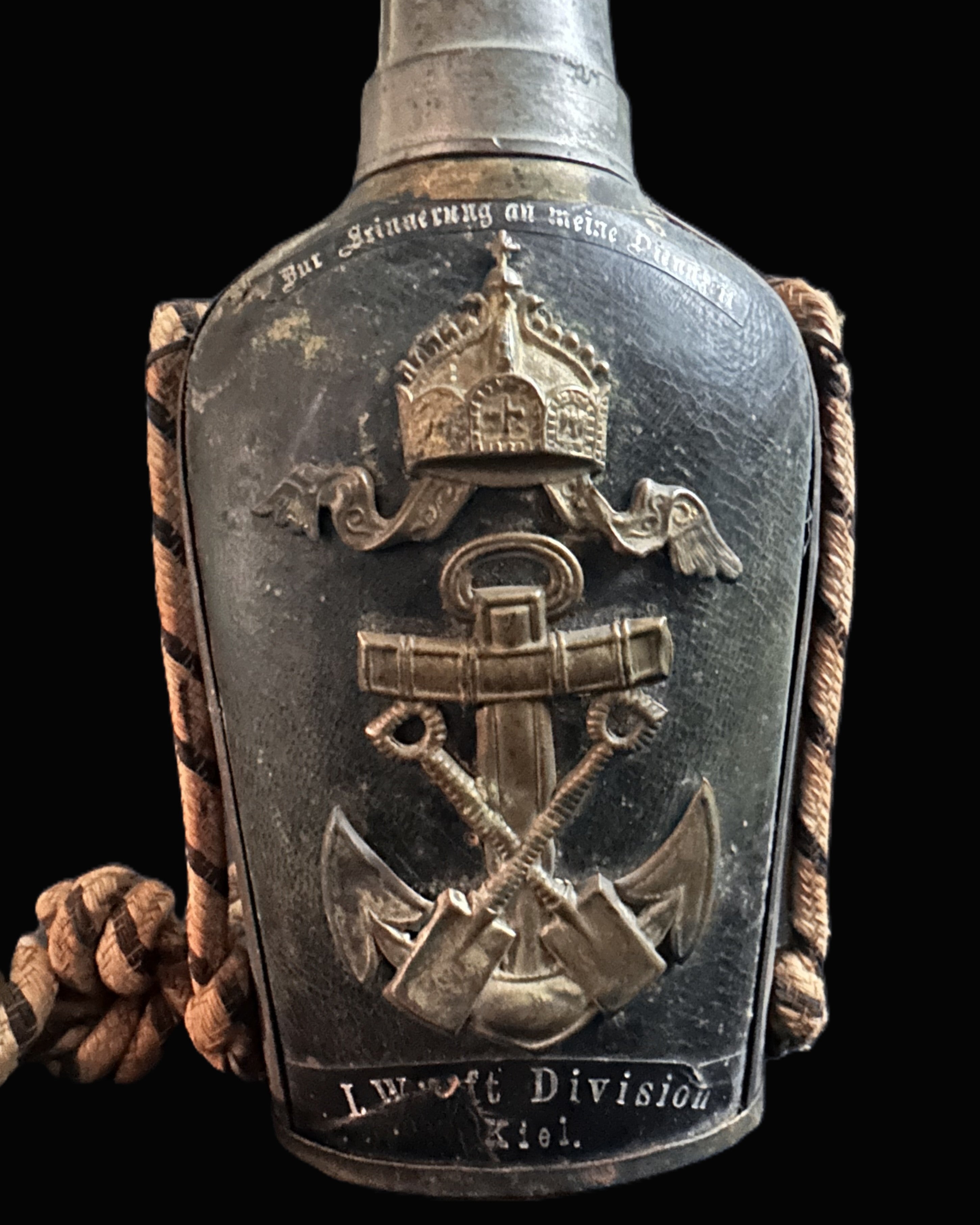 The flask is encased in a black lacquered leather covering, with bold raised decoration in white-metal. The obverse bears the Imperial crown surmounting a large fouled anchor crossed with tools of labor, symbolizing naval dockyard service and the essential role of support divisions in keeping the fleet at readiness. Beneath is the engraved unit designation: “1. Werft Division Kiel.” Above runs the sentiment: “Zur Erinnerung an meine Dienstzeit” (“In remembrance of my service time”).