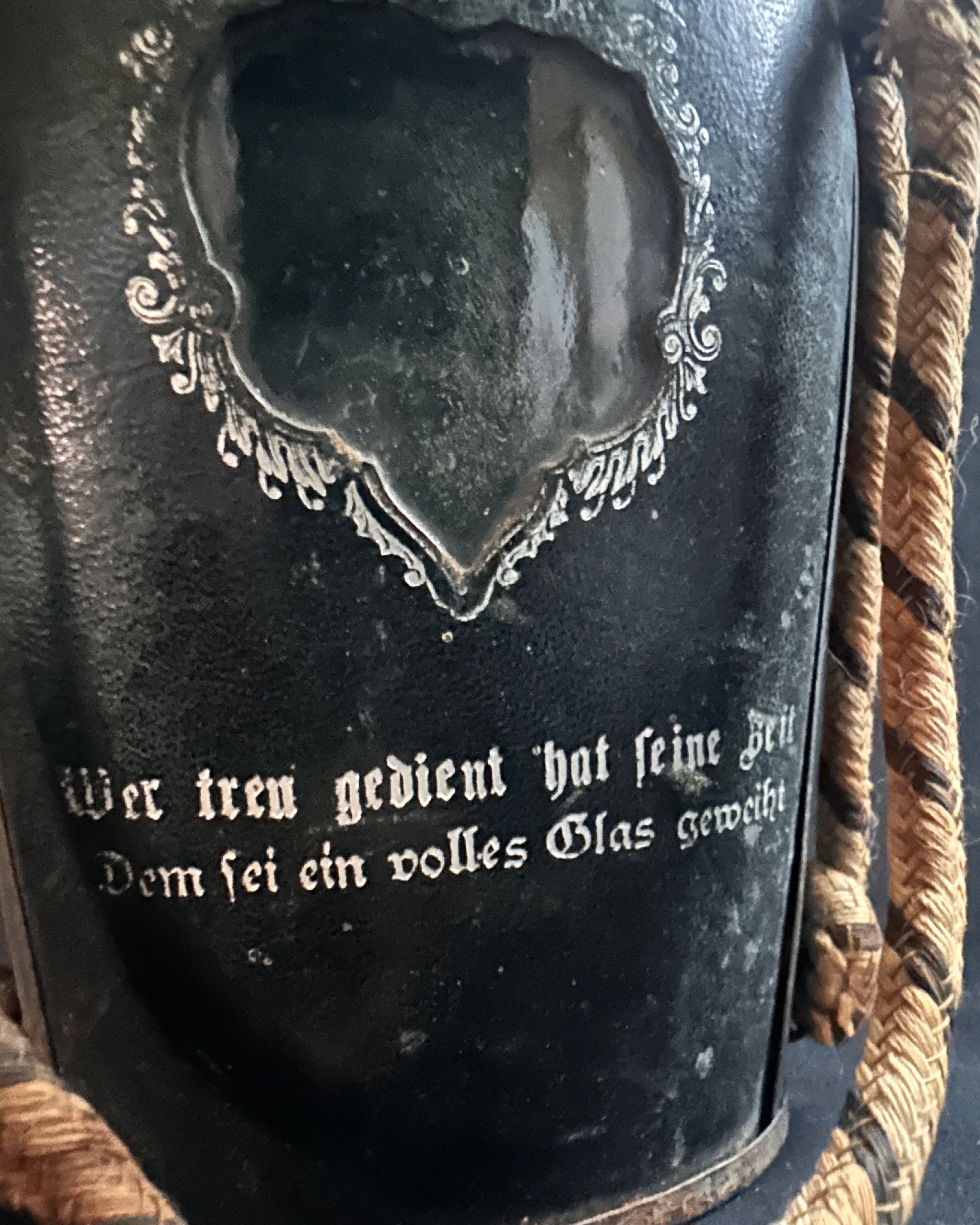 The reverse features an ornate crowned shield with the slogan “Parole – Heimath” (“Password – Homeland”), a patriotic phrase commonly used by German sailors and soldiers to signal their loyalty to Kaiser and country. Below is the toast: “Wer treu gedient hat seine Zeit / Dem sei ein volles Glas geweiht” (“He who has faithfully served his time / To him a full glass is consecrated”). This couplet was a popular saying among conscripts and is rarely seen so well preserved on surviving examples.