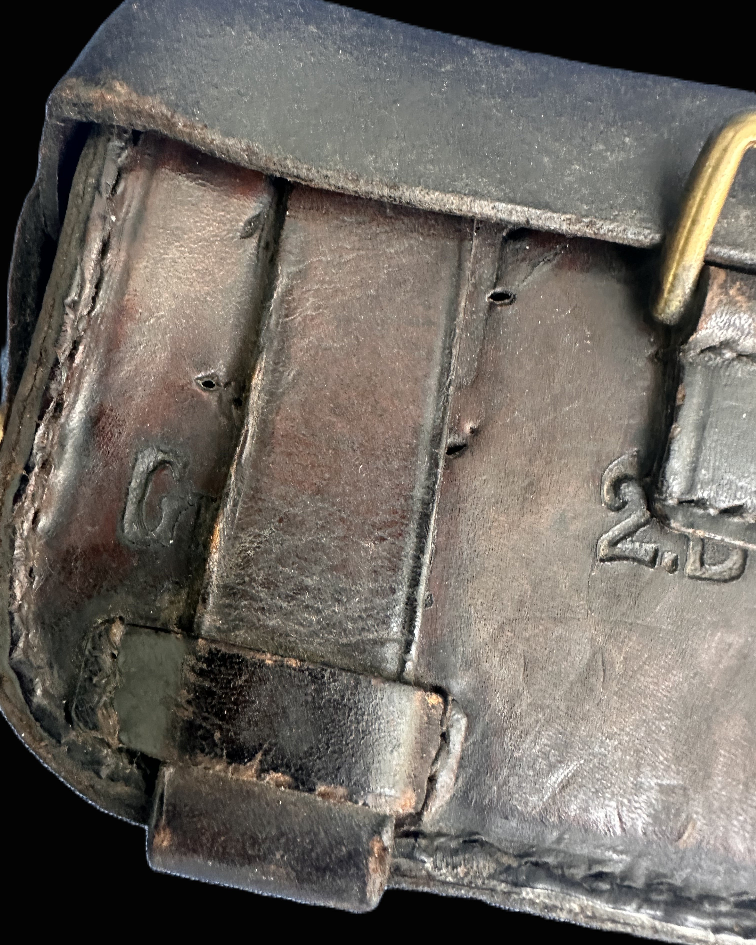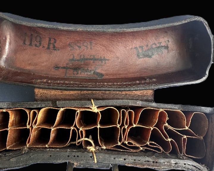 Inside the flap, the pouch is clearly marked "119.R.", indicating issue to the 119th Infantry Regiment, with the unit number followed by the soldier or company designation “2D”. The interior also reveals an excellent maker’s stamp, showing it was manufactured in 1895. The internal stamp is partially legible but confirms military acceptance and the production location. Particularly noteworthy are the unit markings and inspection stamps, which elevate this piece beyond generic examples and into the realm of historically traceable field equipment.