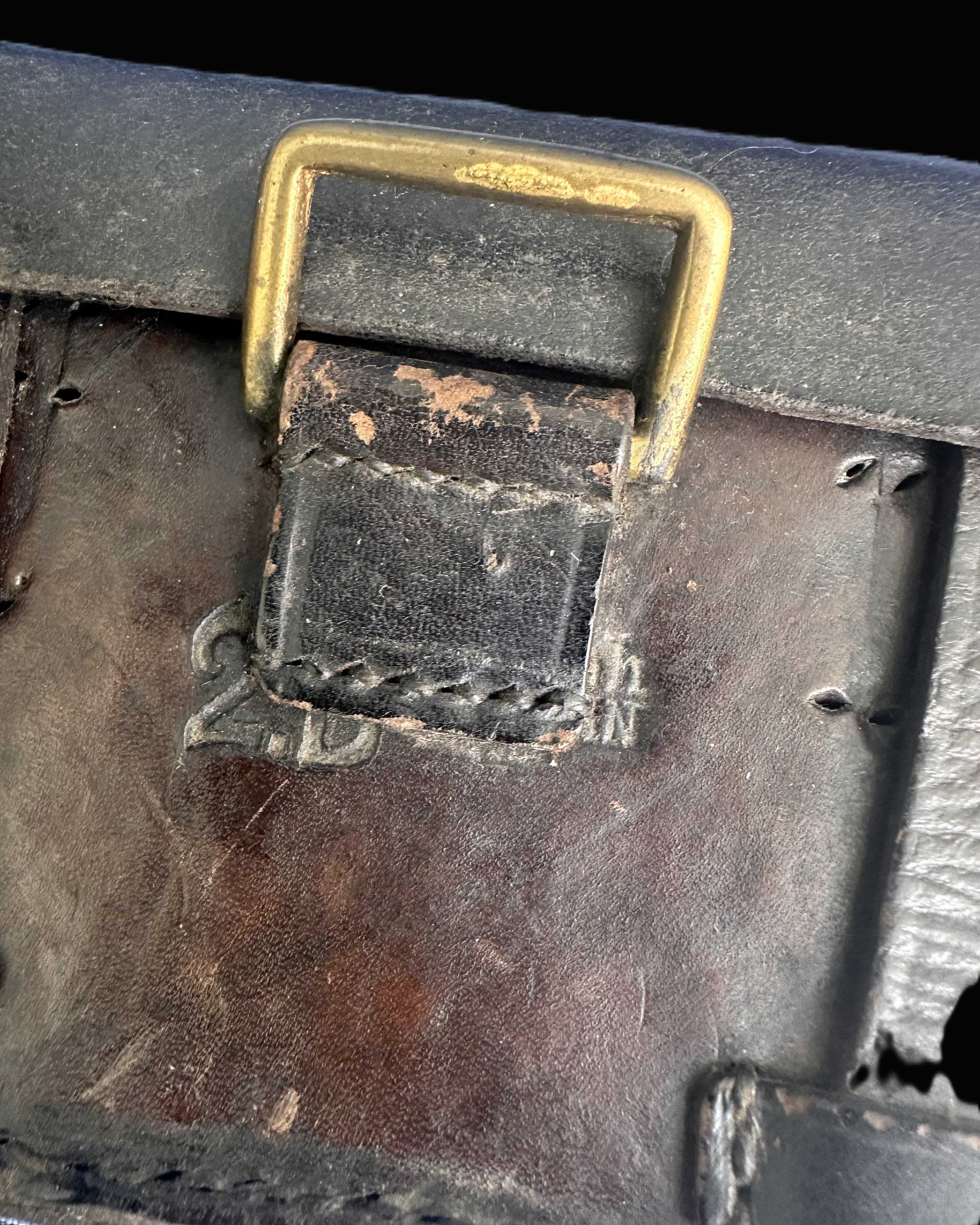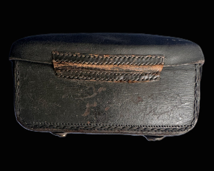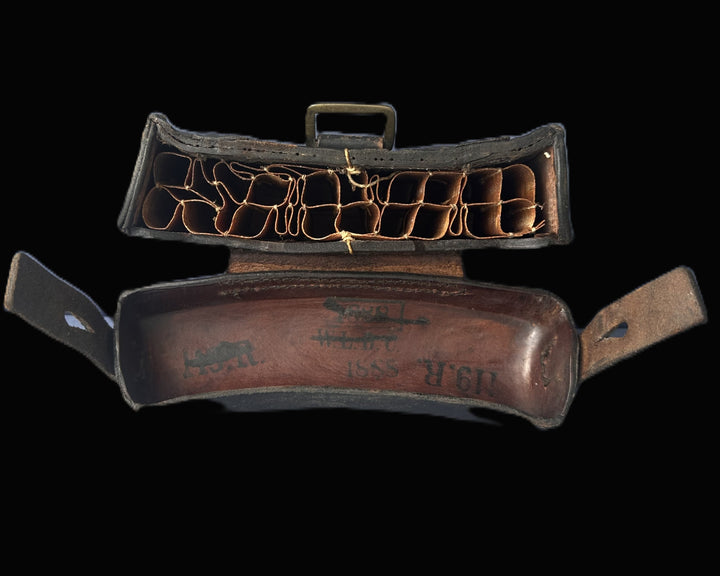 The pouch features a solid construction of thick blackened leather, with all internal cartridge compartments intact. These carefully formed slots would have housed the 7.92mm rounds for the Gewehr 88 rifle, in use during this period before the Gewehr 98 became standard. The pouch still retains its original brass buckle on the rear, along with reinforced riveted strap loops. The design reflects both form and function typical of the Kaiserzeit field gear — rugged yet detailed, with utilitarian elegance.